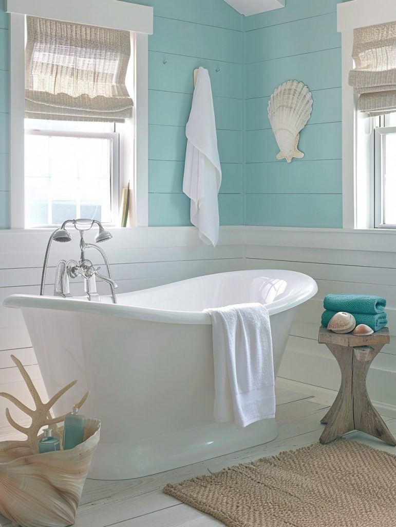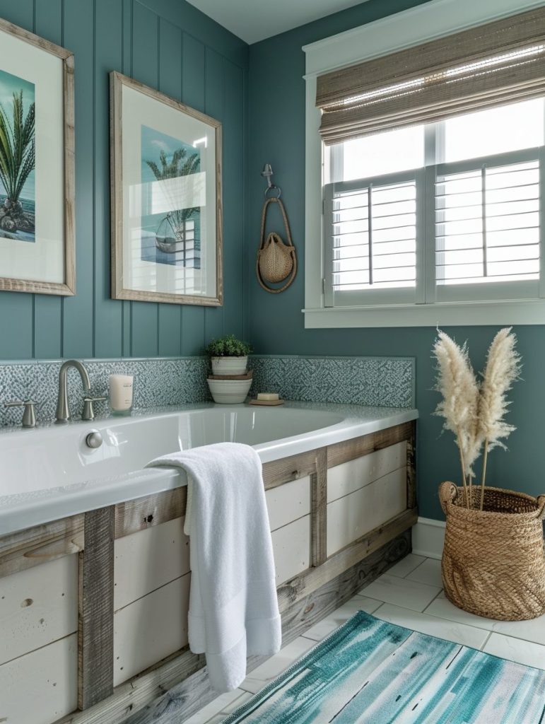 Enhance the ambiance with beach-inspired towels, seaside artwork, and fresh flowers to complete the look.