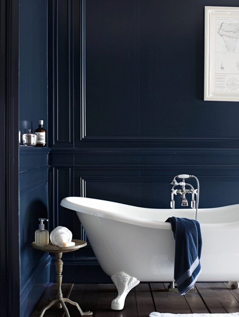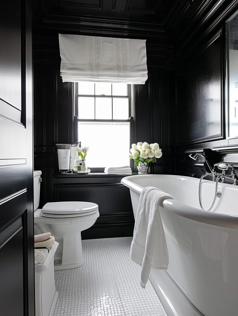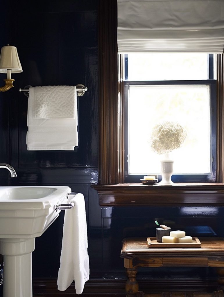 Navy blue introduces a timeless and sophisticated charm to any bathroom. Deep navy walls paired with crisp white fixtures and metallic accents create a striking and elegant contrast.
