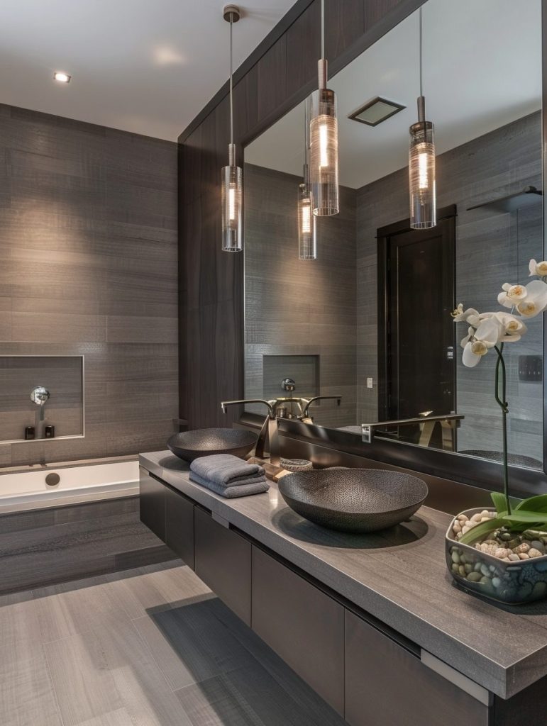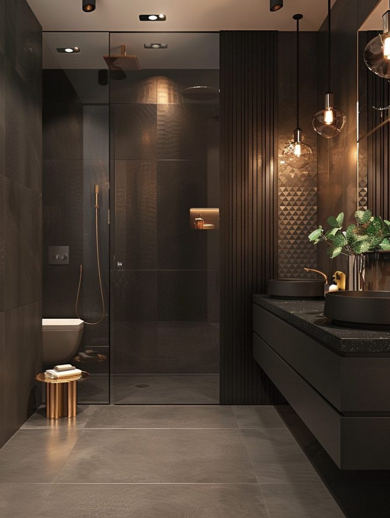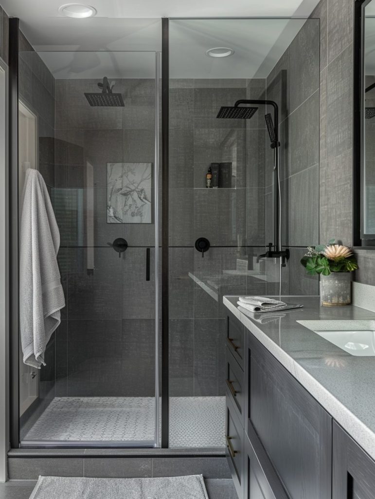 A bathroom styled with graphite and charcoal tones offers a timeless yet contemporary appeal. Layering different shades of these deep greys on the walls, paired with metal fixtures and minimalist decor, creates a sleek and sophisticated look.