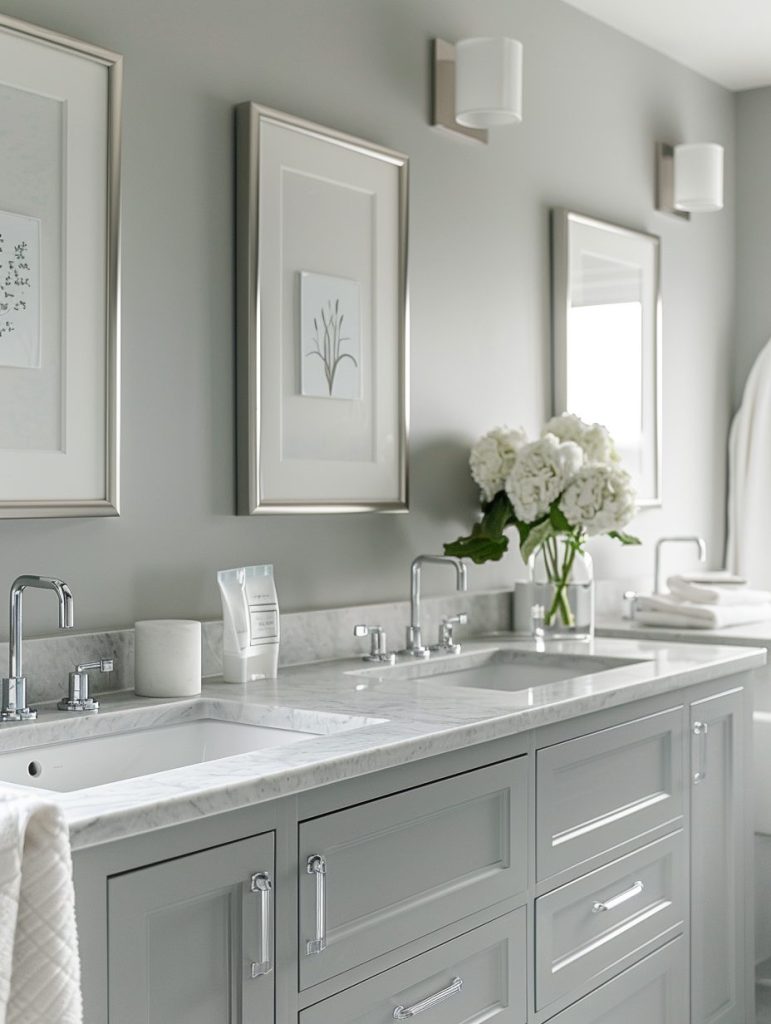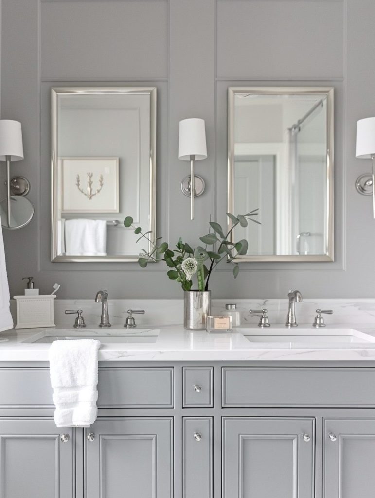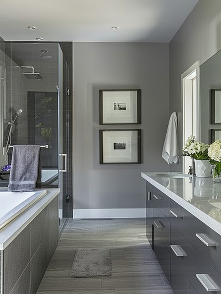 Soft silver and grey tones bring a modern, sophisticated touch to bathroom design. Light grey walls paired with subtle silver accents create a sleek and slightly edgy aesthetic. Enhance the understated elegance with features like a grey vanity, silver-framed mirrors, and clean, minimal decor.