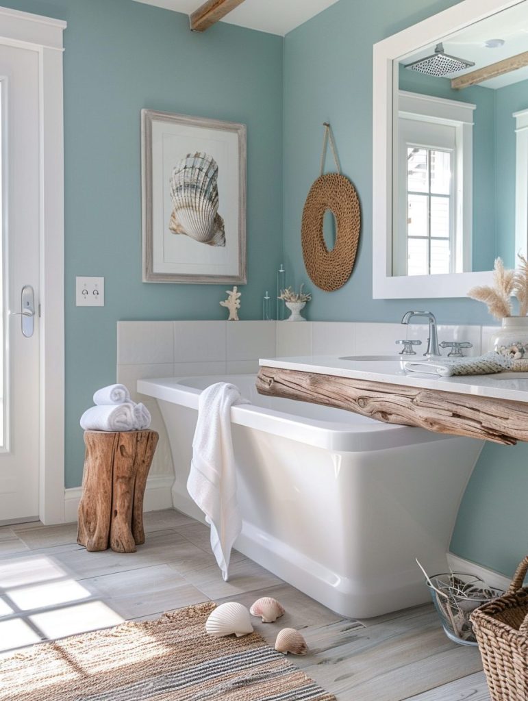 Enhance the seaside vibe with decorative touches like seashells, driftwood elements, and soft, textured fabrics. This design is ideal for those dreaming of a bathroom that feels like a breezy beach getaway.