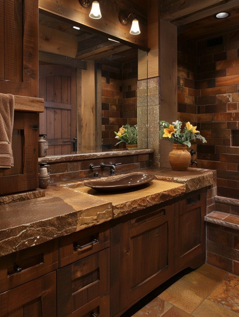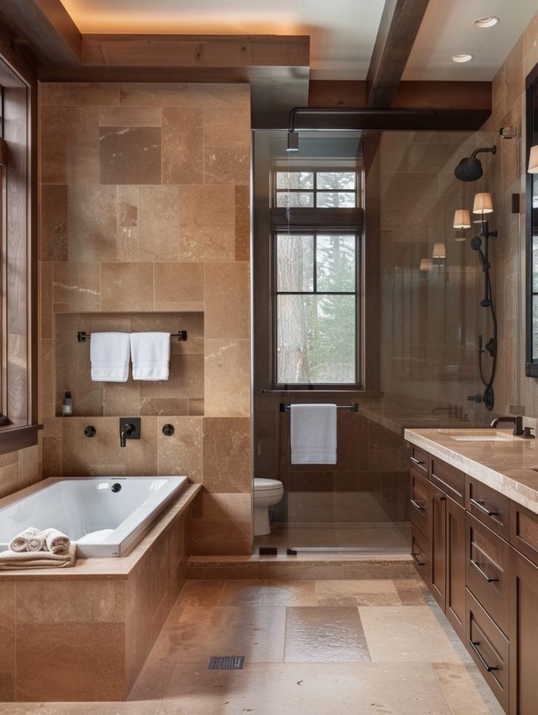 Consider using brown tiles, wooden cabinetry, and stone countertops to enhance the earthy appeal. This design suits those who enjoy a bathroom space that feels both comforting and subtly luxurious.