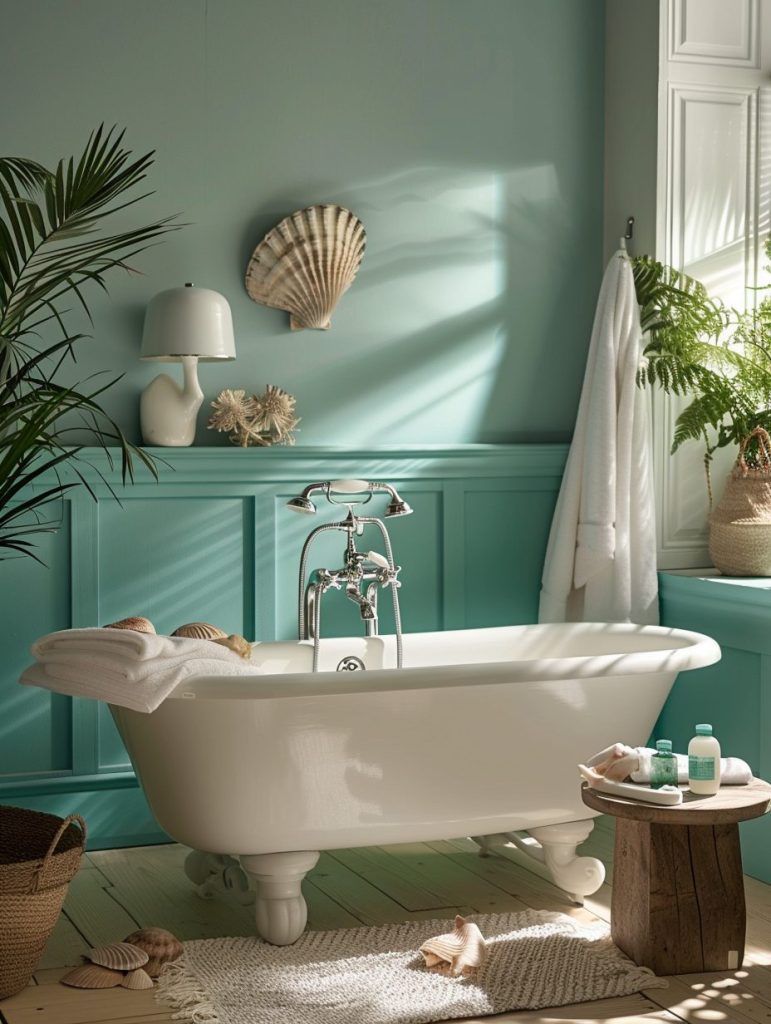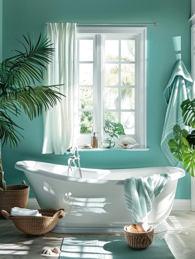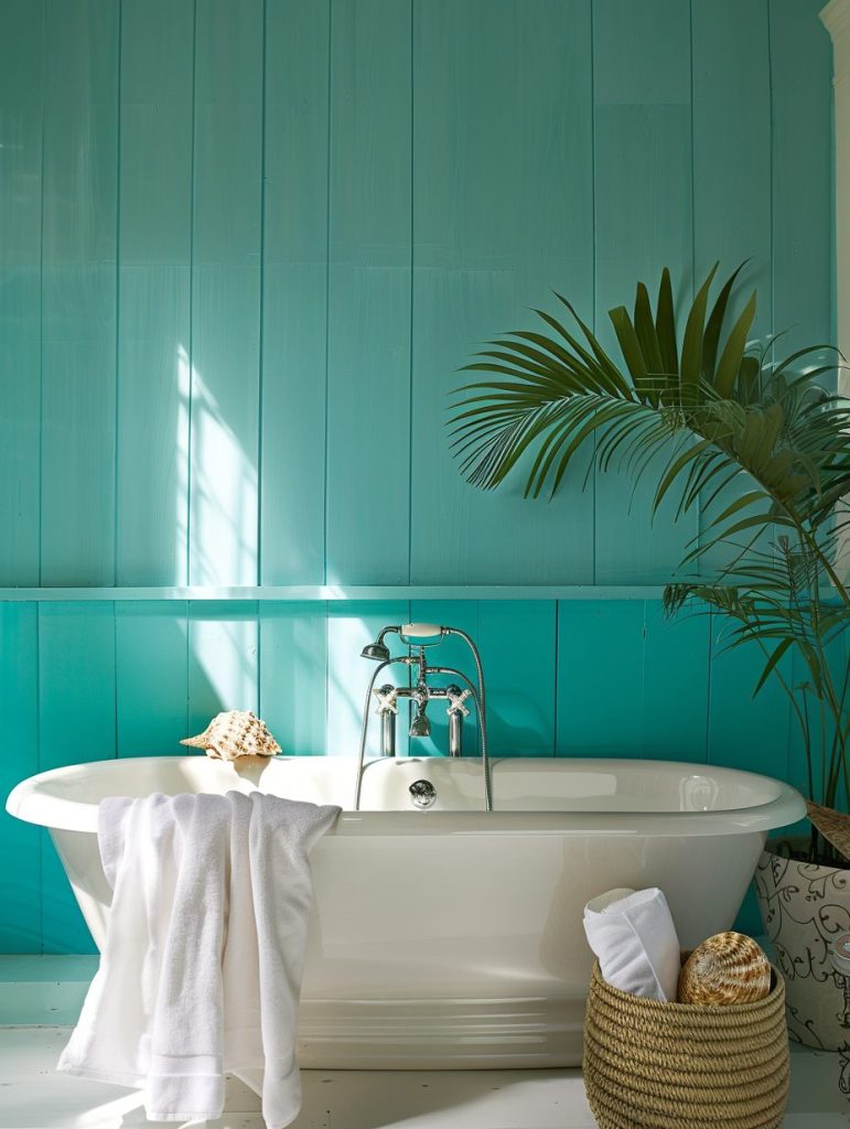 Turquoise captures the serene essence of the ocean, making it a perfect centerpiece for a beach-inspired bathroom. Combine green-blue walls with white fixtures and sandy beige accents to create a space that feels calm and coastal.