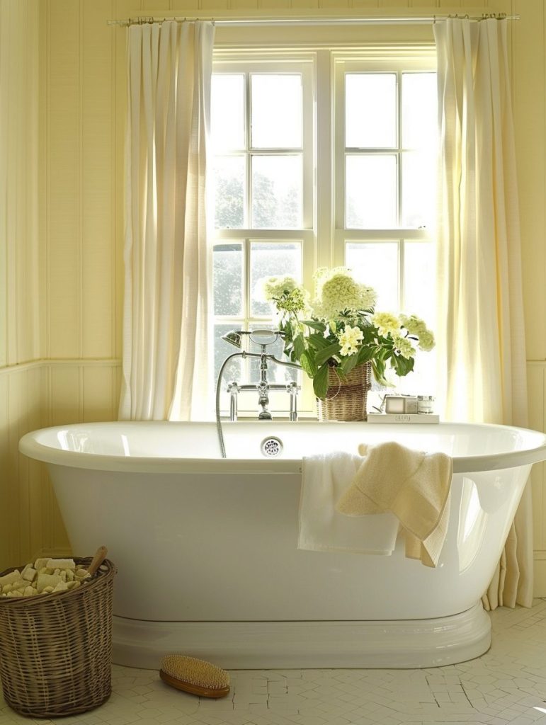 Light tones can enhance the brightness and joyful feel of a bathroom. Soft yellow walls combined with white fixtures and natural wood accents create a warm, sunlit atmosphere.