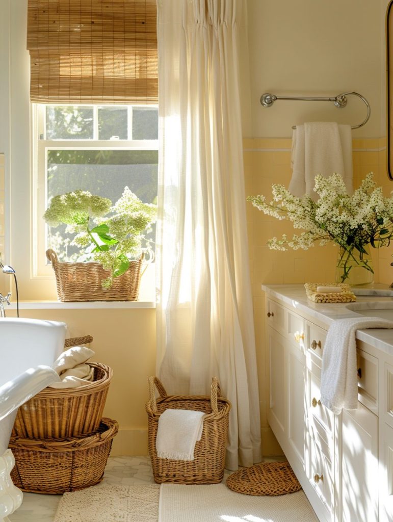 Add charm with details like fresh flowers, wicker baskets, and airy, light-colored curtains. This design is perfect for those seeking a cheerful and inviting bathroom space.