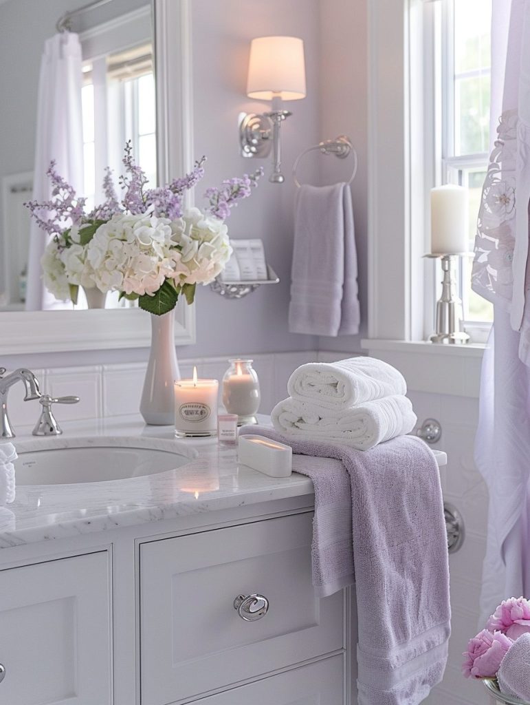Violet hues bring a serene and soothing vibe, making them ideal for crafting a calm bathroom atmosphere. Soft lavender or lilac walls paired with white or grey fixtures and delicate floral accents create a peaceful and stylish space.