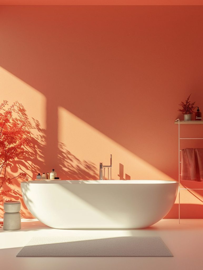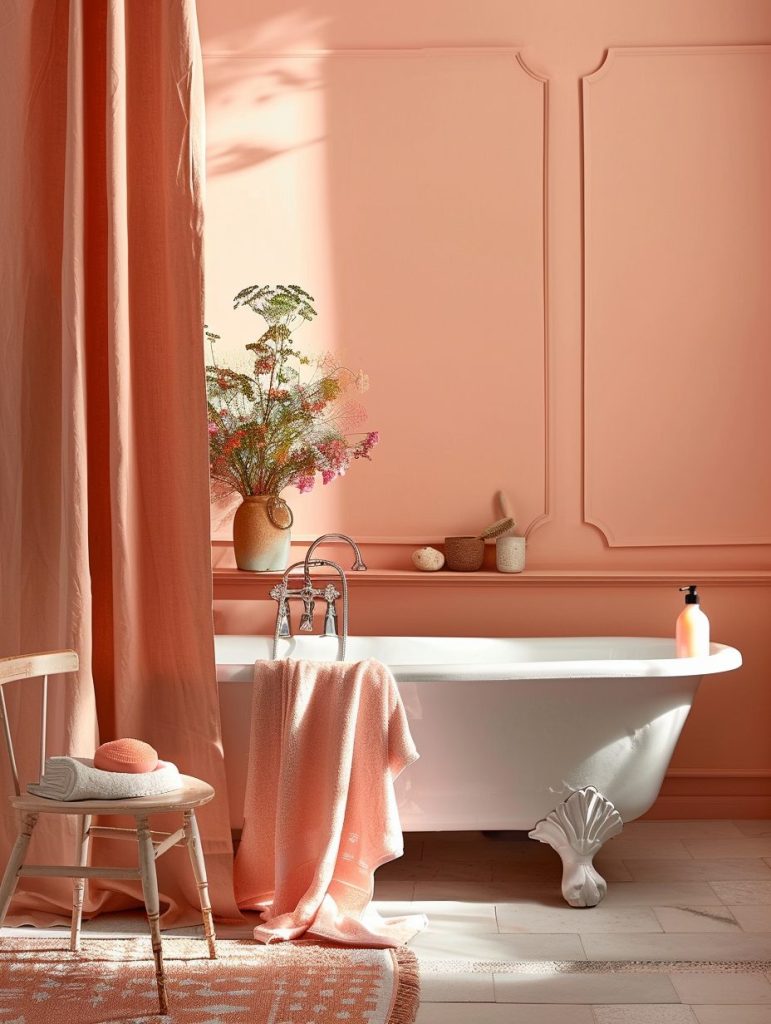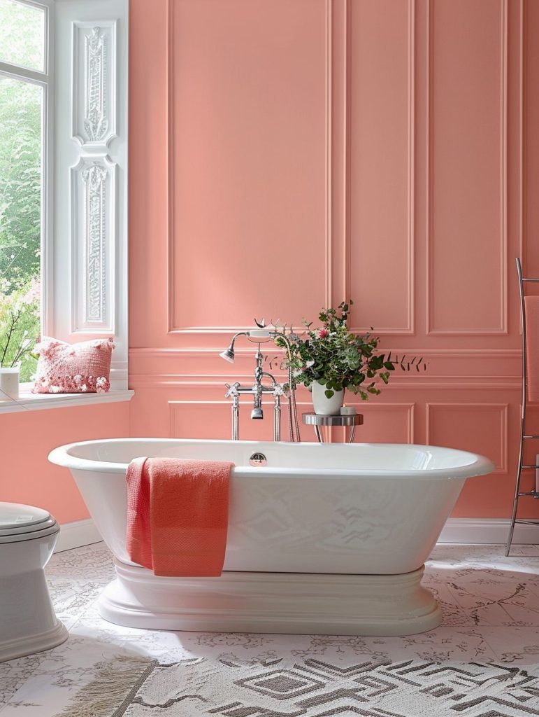 Bright coral and peach tones bring a cheerful, energetic vibe to your bathroom. Pairing coral or peach walls with light grey or white fixtures and coastal-themed decor creates a lively, inviting space.
