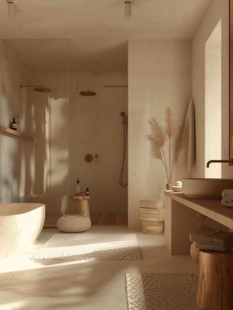 Minimalist bathrooms emphasize clean design and functional elegance. Neutral shades like grey, beige, and soft white dominate the palette, creating a serene and uncluttered atmosphere.