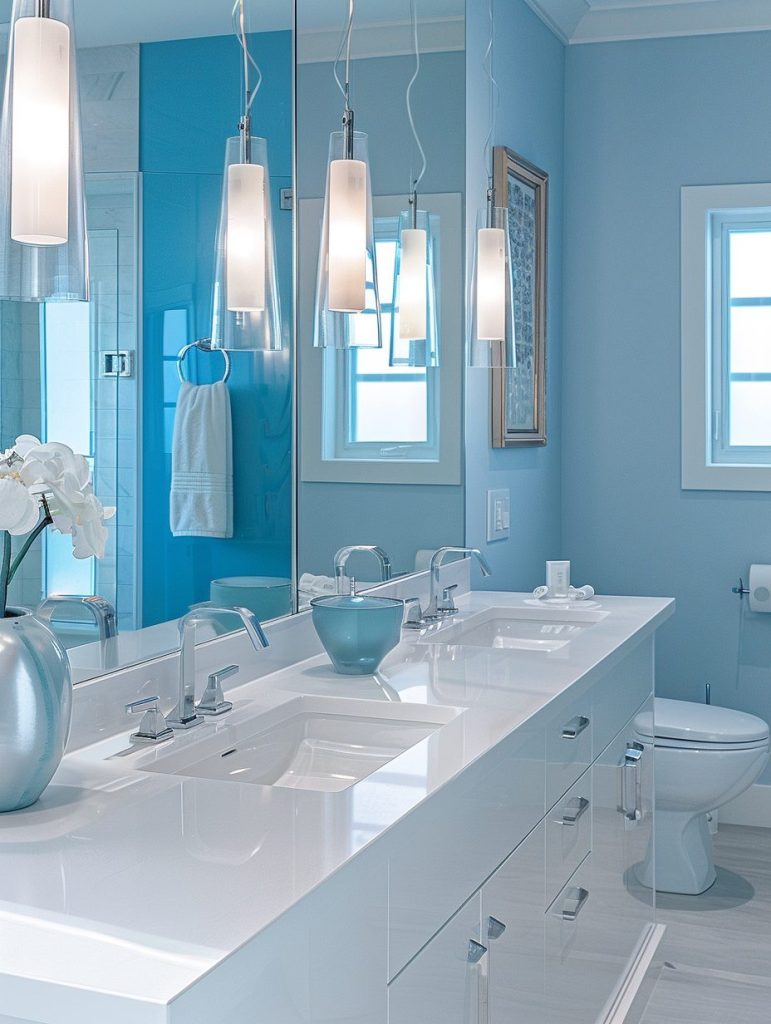 Enhance the soothing ambiance with touches like blue glass decor, sleek vanities, and modern lighting. This design is perfect for those who value a serene and visually appealing bathroom environment.