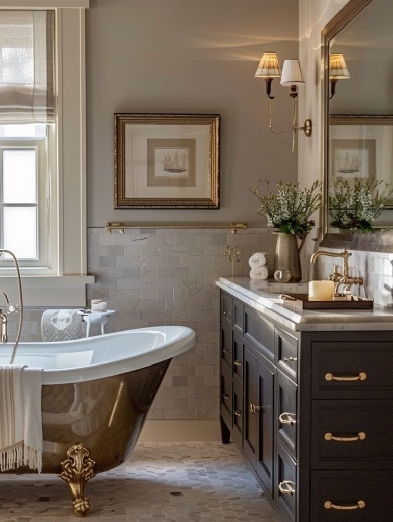 Enhance the look with lush greenery, marble surfaces, and plush textiles to complete the elegant vibe. This style is ideal for those who desire a bathroom that feels both lavish and tranquil.