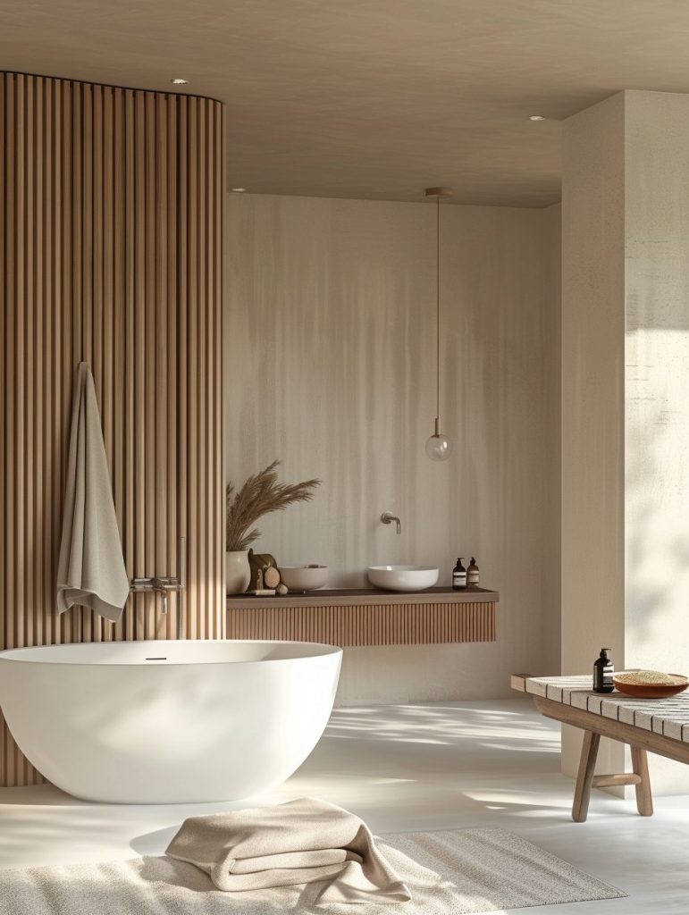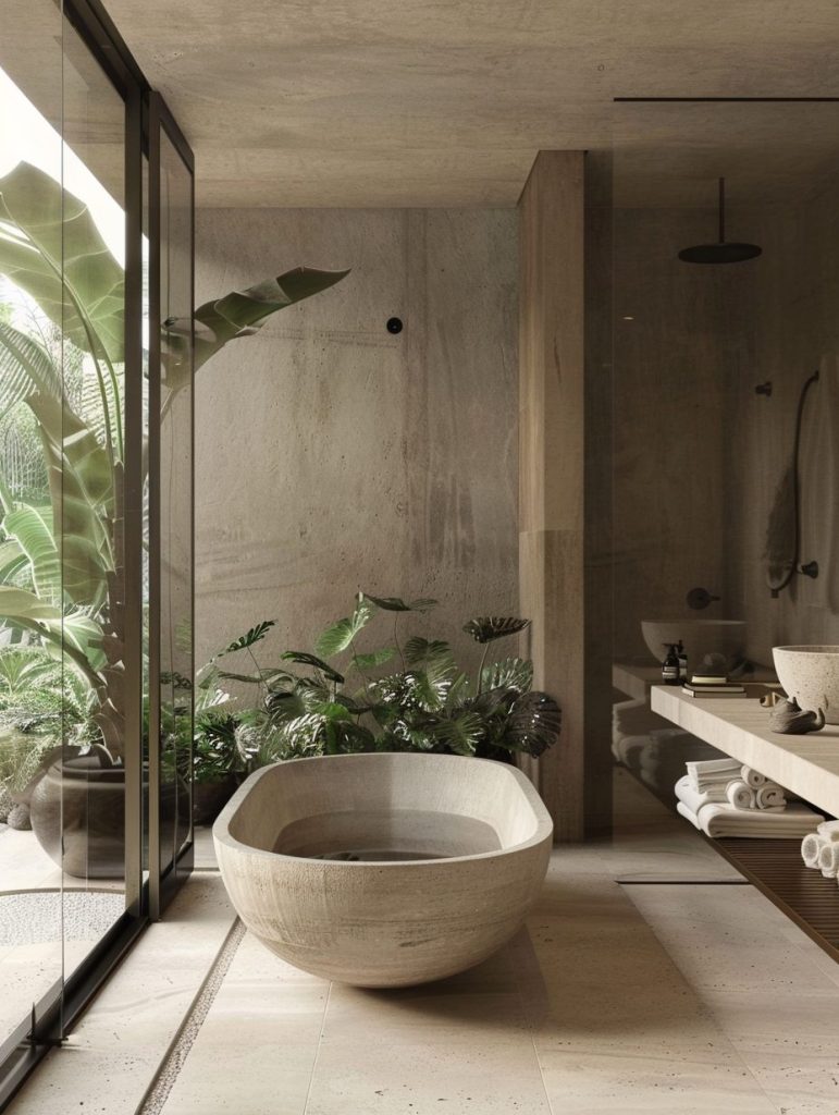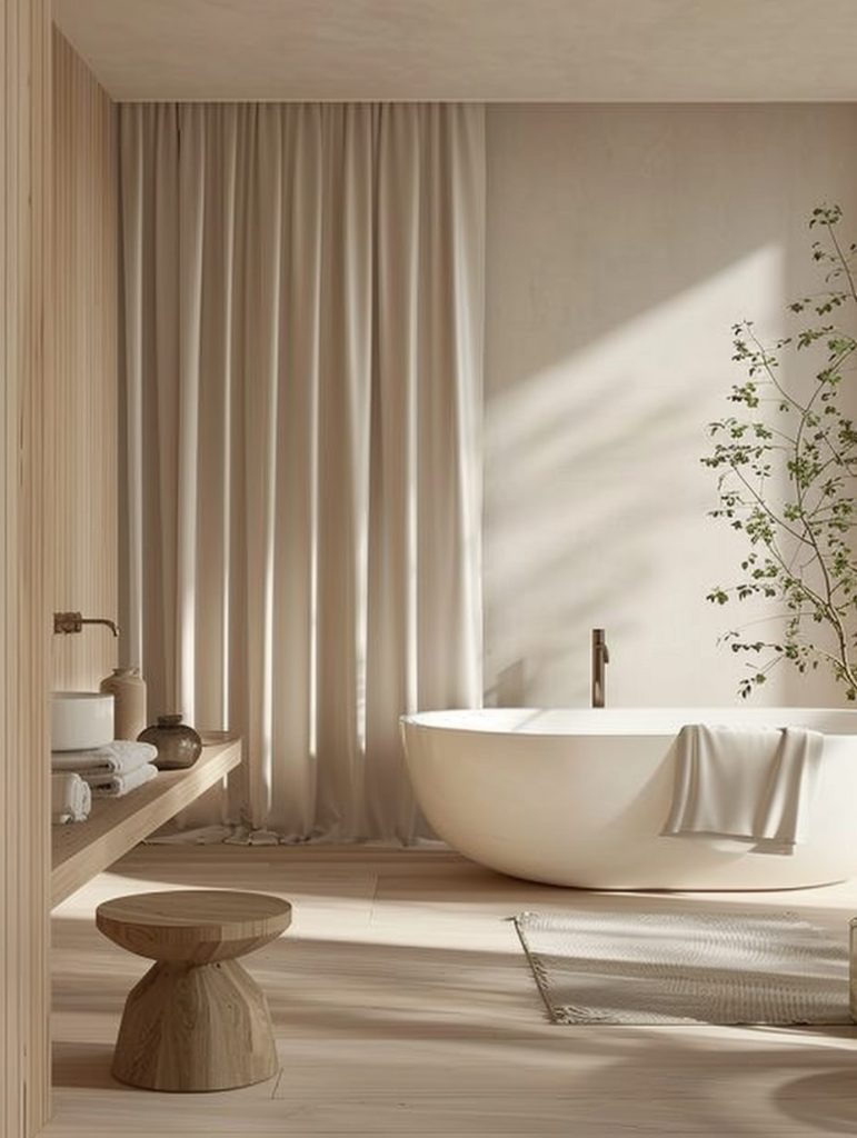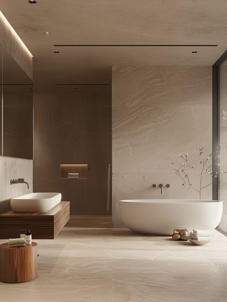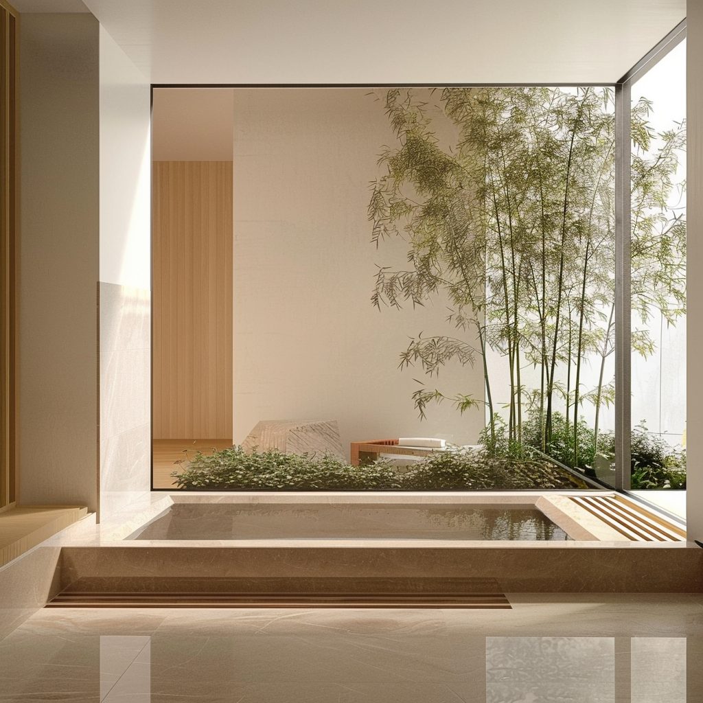 A neutral color palette and minimal design elements maintain a calm, uncluttered environment. Features like a Japanese soaking tub or a small indoor garden can enhance the soothing, meditative ambiance.