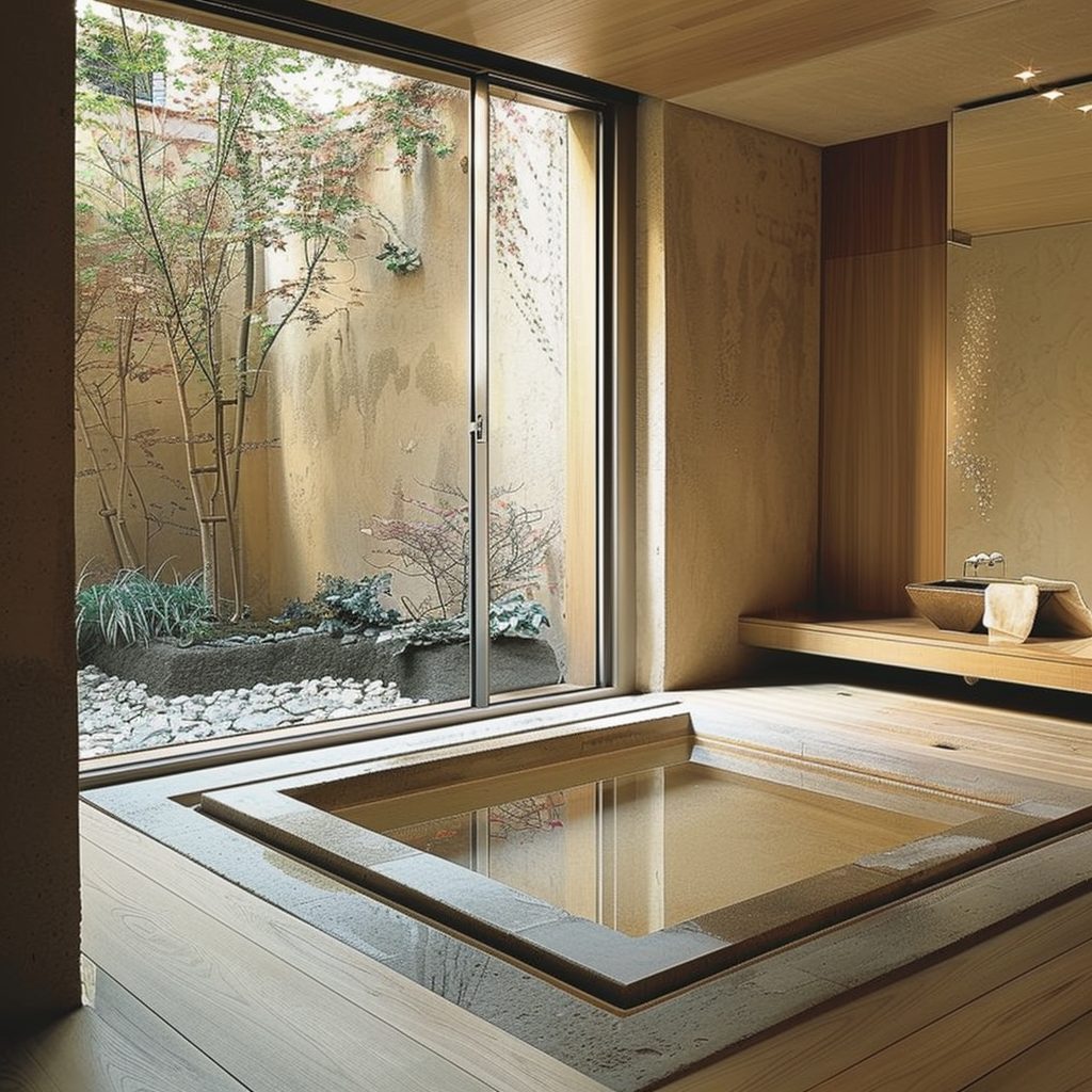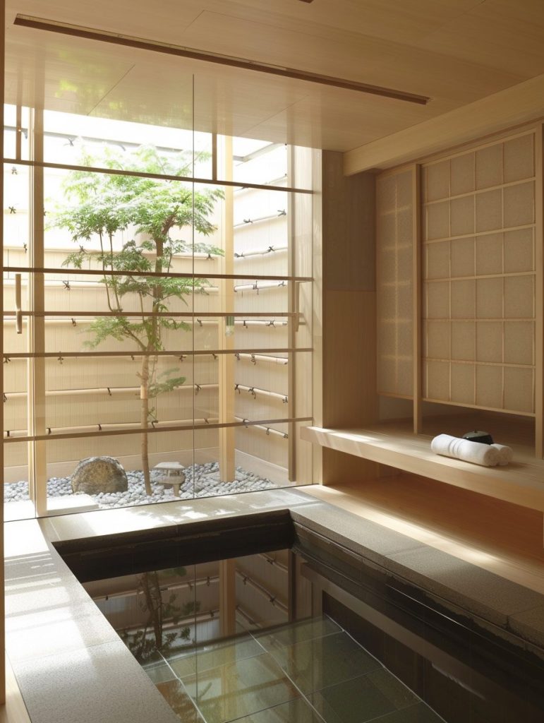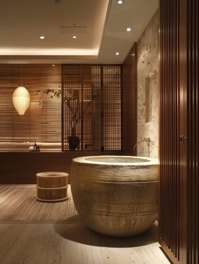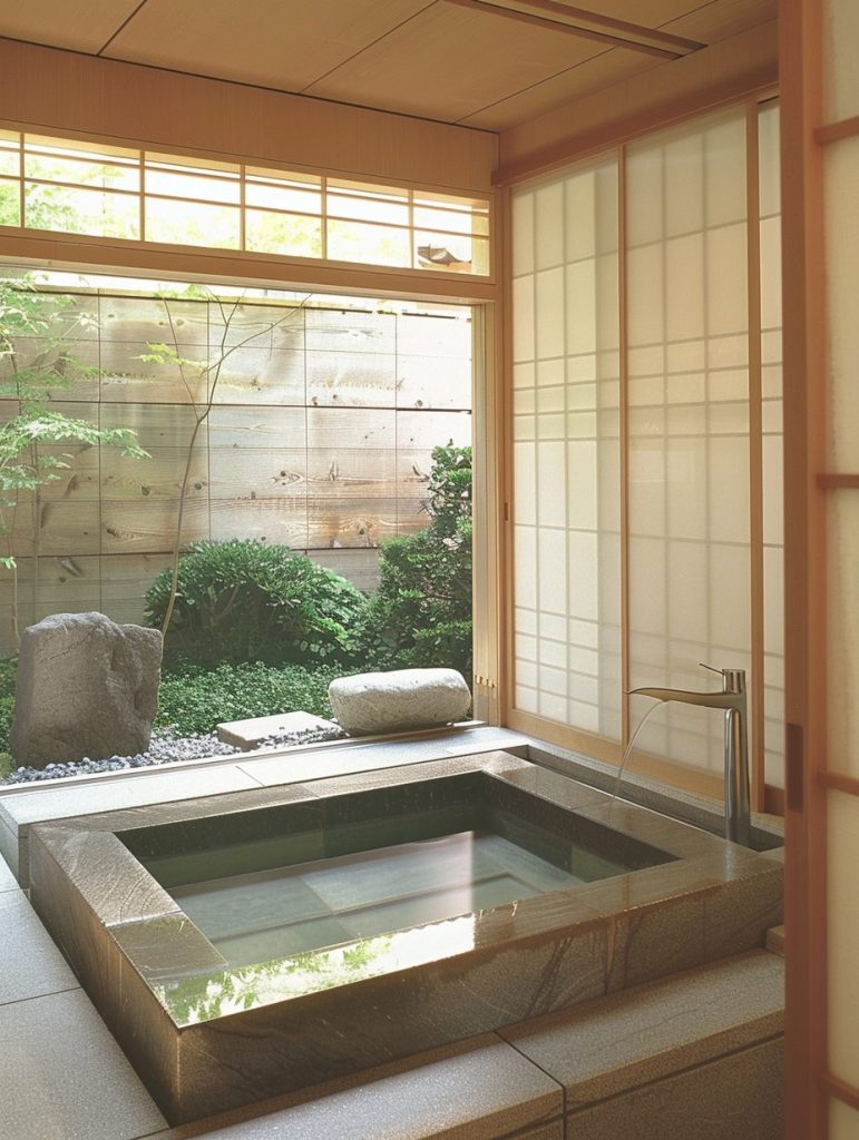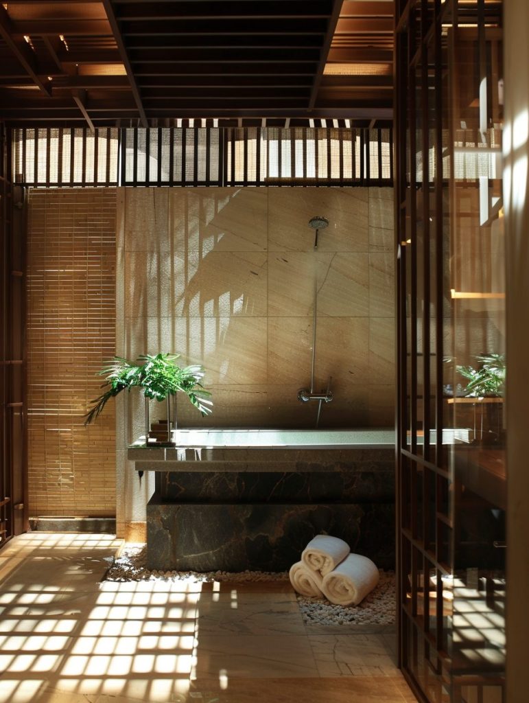 Add features like a deep soaking tub, sliding shoji screens, and an indoor garden to enhance the tranquil ambiance. This design focuses on creating a serene space perfect for relaxation and reflection.