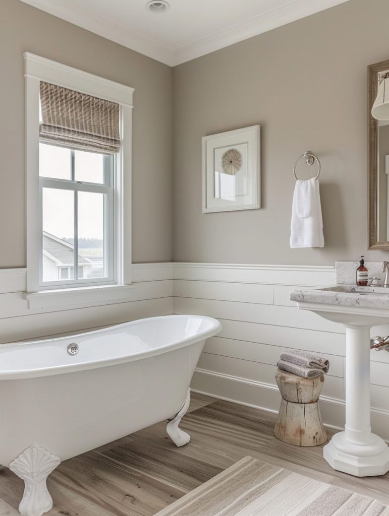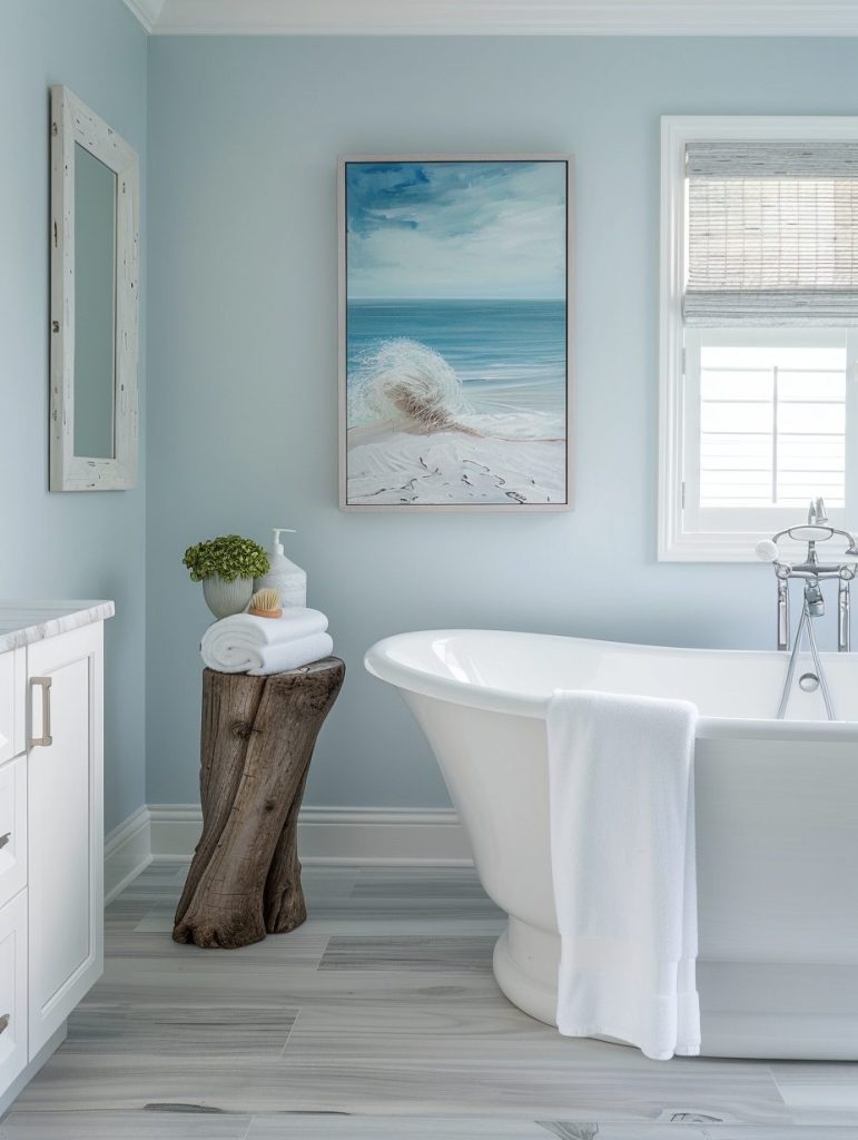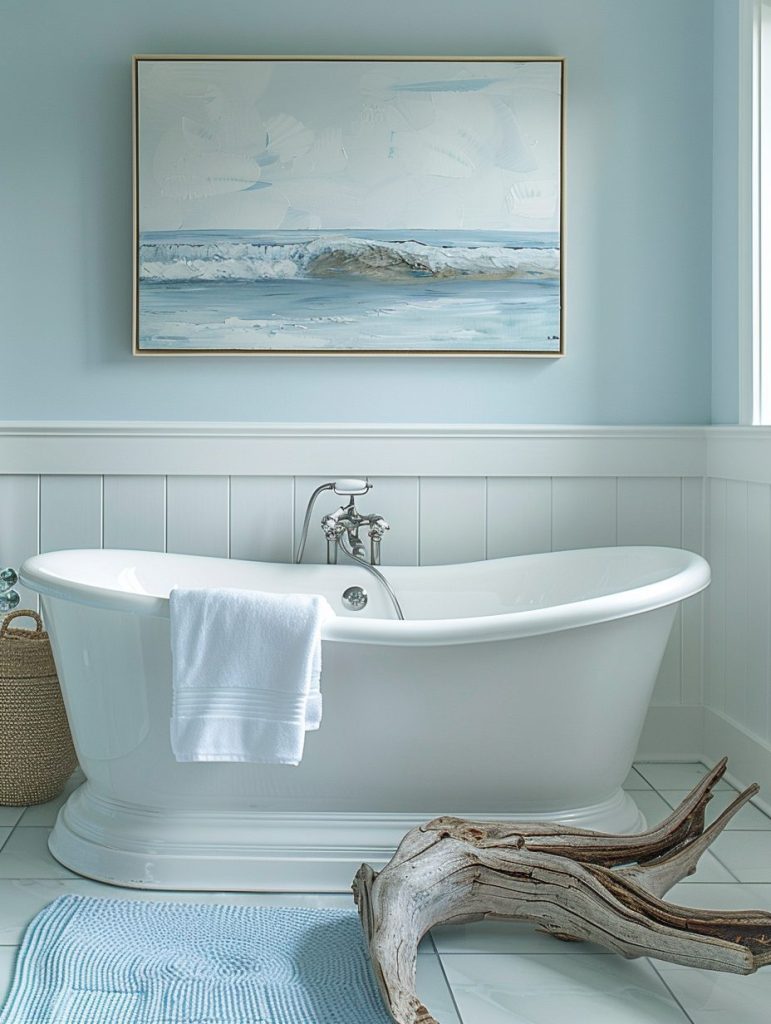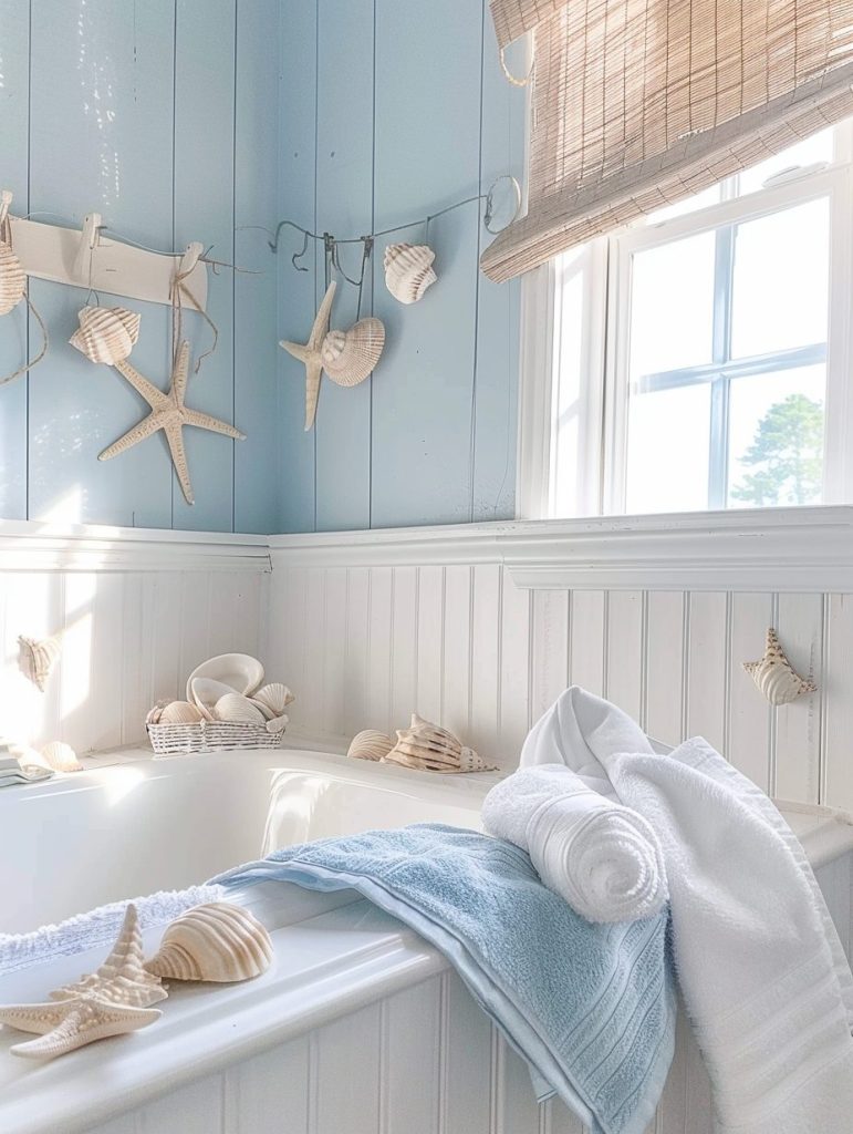 Bring the soothing spirit of the coast into your bathroom with a palette of soft blues, crisp whites, and sandy neutrals. Accentuate the beachy vibe with nautical touches like seashells, driftwood, and ocean-inspired art.