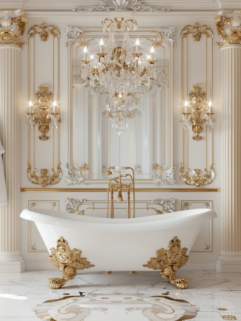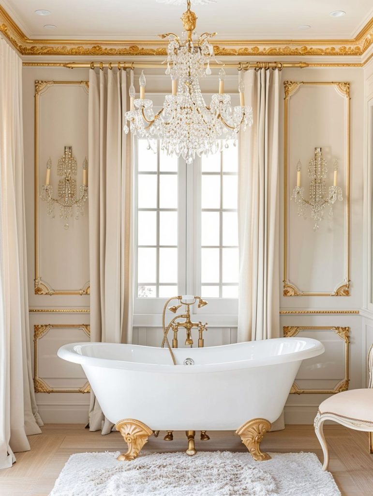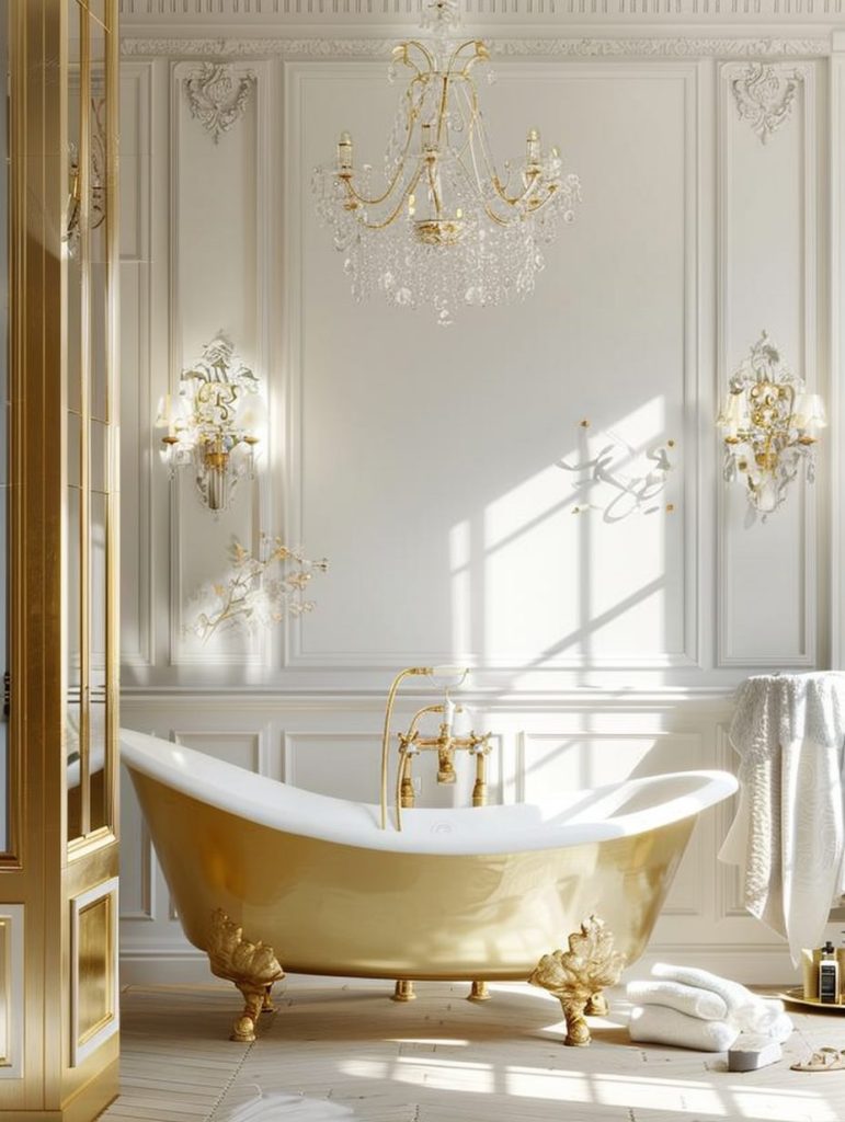 Parisian chic bathrooms capture the essence of elegance and refined glamour. A white and gold color scheme sets a luxurious tone, complemented by ornate fixtures and decorative accents.
