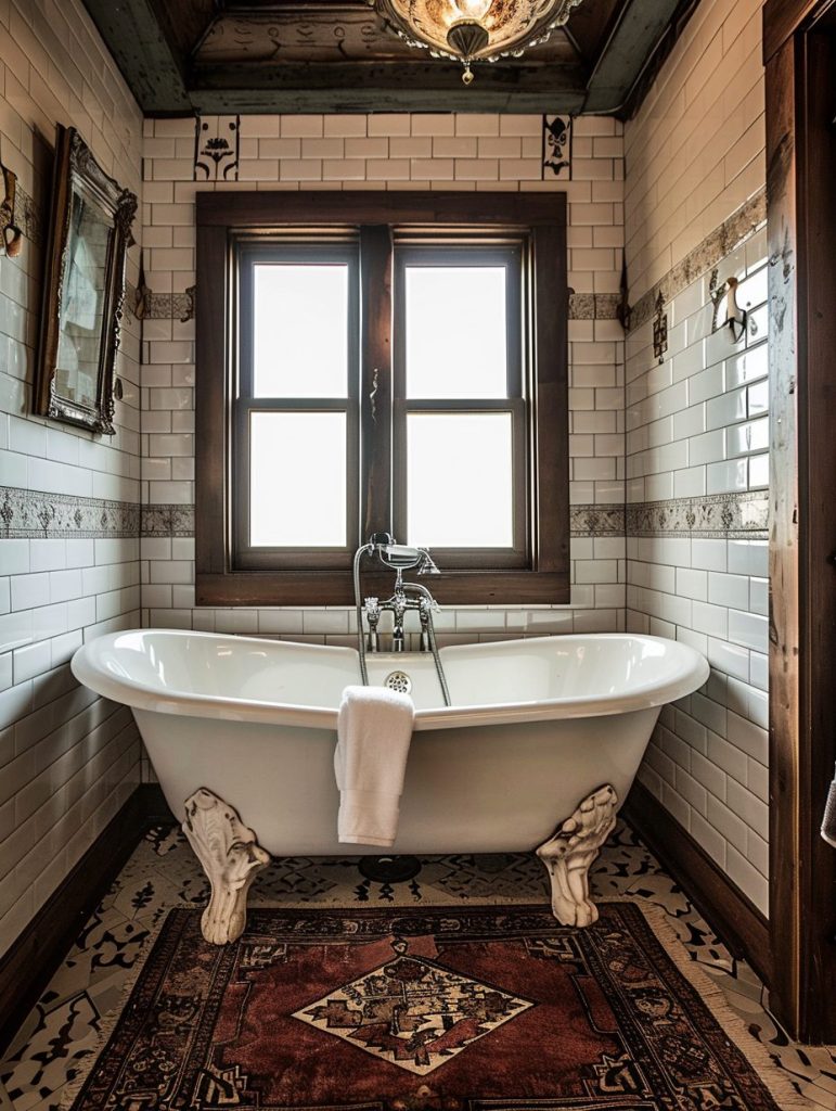 Victorian-style bathrooms beautifully blend artistic detail with timeless elegance. Signature elements include ornate features, clawfoot bathtubs, and vintage-patterned tiles that create a rich visual impact.
