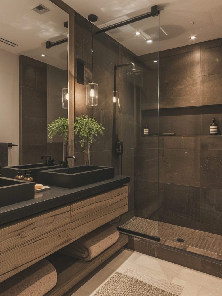 An organic modern bathroom seamlessly fuses natural materials with sleek, contemporary design. Use elements like wood, stone, and concrete within a neutral color palette to ground the space.