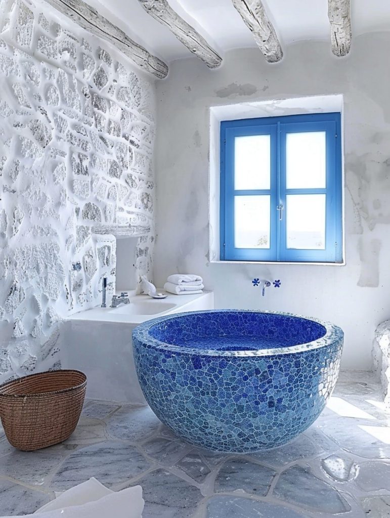 Elements such as blue mosaic tiles, whitewashed walls, and understated yet elegant lighting bring the charm of a serene Greek island into your home.