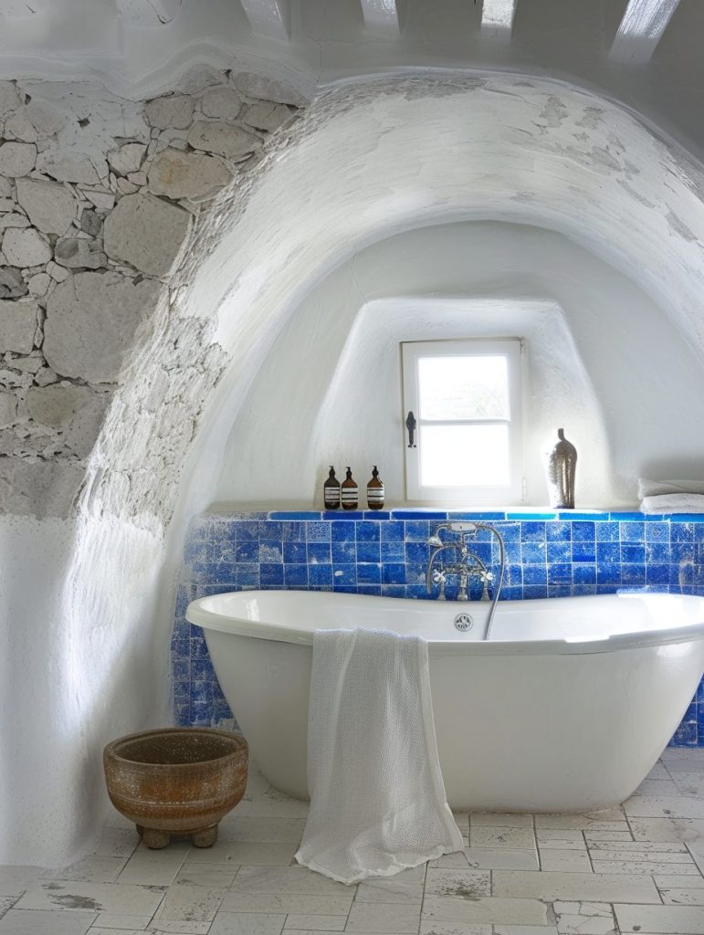 A Greek Isles-inspired bathroom captures the spirit of the Mediterranean with its fresh palette of bright whites and deep blues. Natural materials like marble and stone add both texture and timelessness to the space.