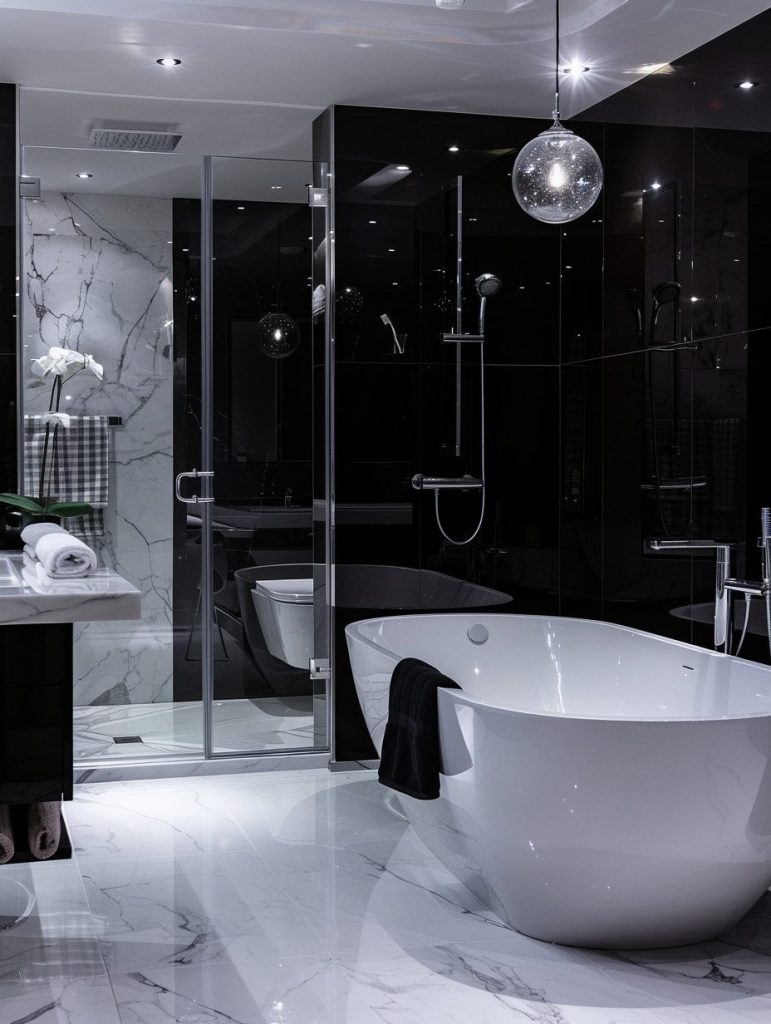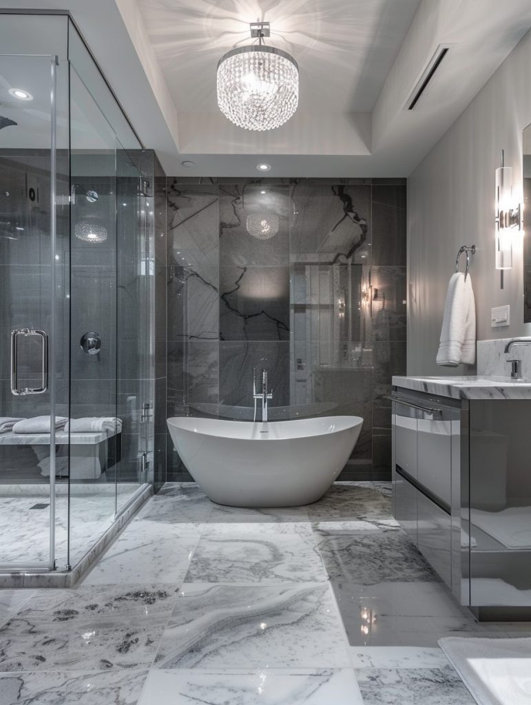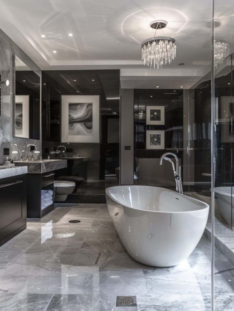 A contemporary luxury bathroom blends modern design with timeless elegance.