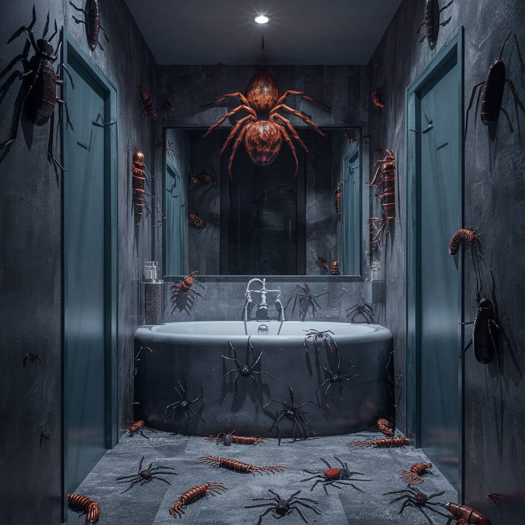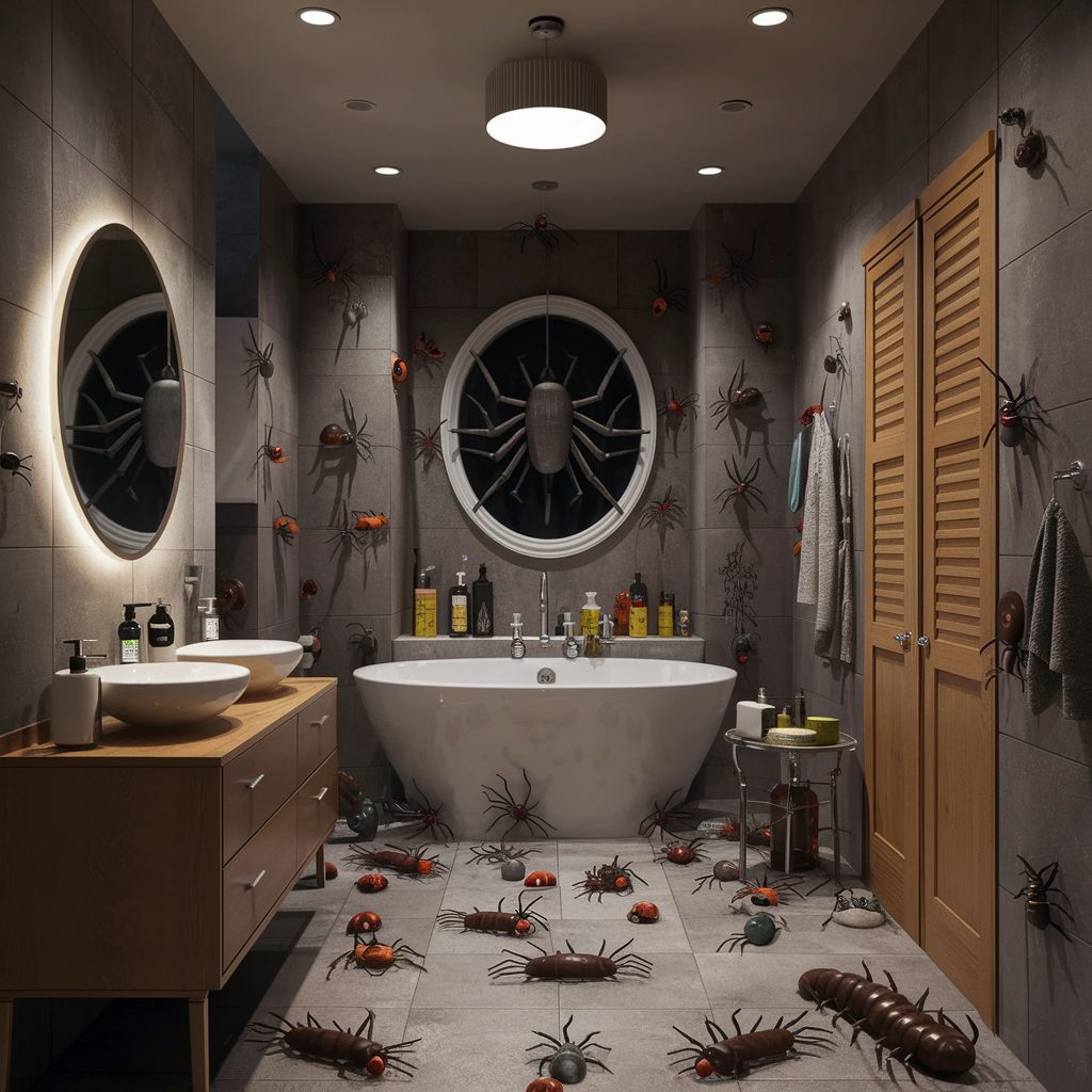 If you’re decorating for thrill-seekers who get the chills from all things creepy and crawly, an insect-themed Halloween bathroom is the perfect choice. Embrace the fear factor by covering the walls with hyper-realistic insect decals—think swarms of spiders, beetles, or flies—and place plastic centipedes slithering along the floor for a surprise underfoot. For an even more shocking effect, hang artificial roaches from the ceiling or let them “crawl” out from behind the mirror.
