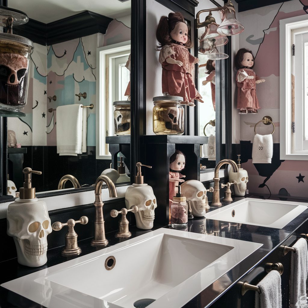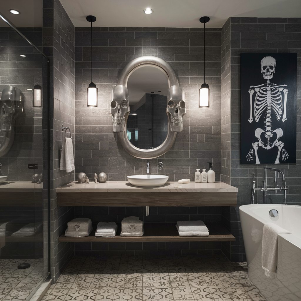 To take the decor to the next level, make a bold statement by featuring a large skull as a focal point—perhaps in the form of a skull-shaped mirror, towel holder, or decorative shelf accent.