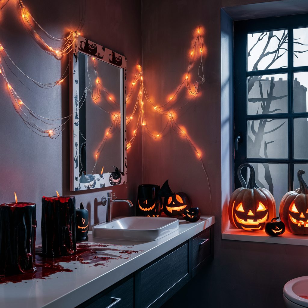 For a touch of dramatic flair, incorporate candles that drip with red wax resembling blood, which adds an element of macabre elegance. Hanging pumpkin lanterns near mirrors or above the vanity introduces warmth and character, while witch-themed string lights can provide a whimsical yet creepy balance.