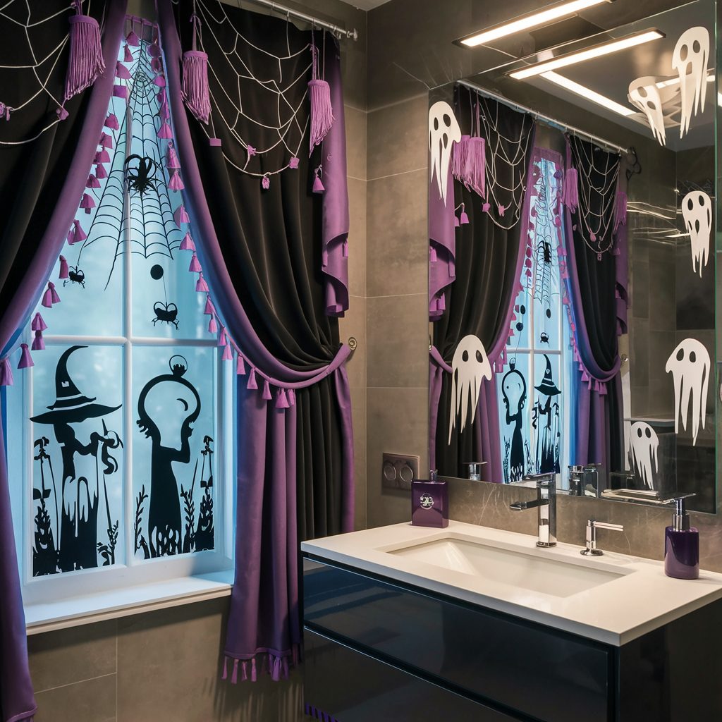 Halloween window treatments work especially well in small or guest bathrooms, where even minor decor elements can make a big impact. A well-dressed window can truly tie together the entire Halloween bathroom decor, giving it a polished and hauntingly festive finish.