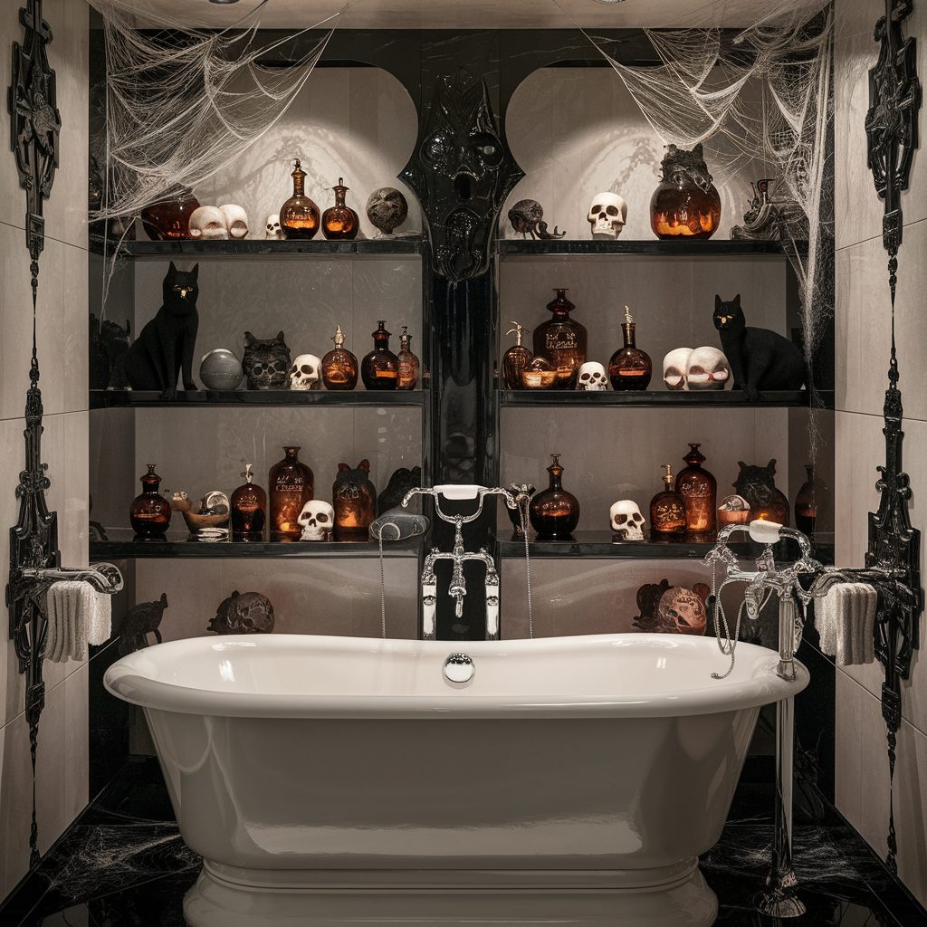 With just a few thoughtfully chosen pieces, you can transform a simple bathroom into a hauntingly charming Halloween retreat.