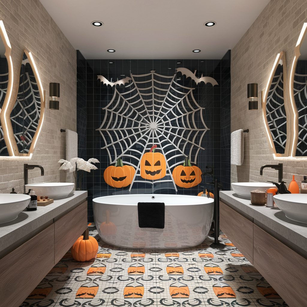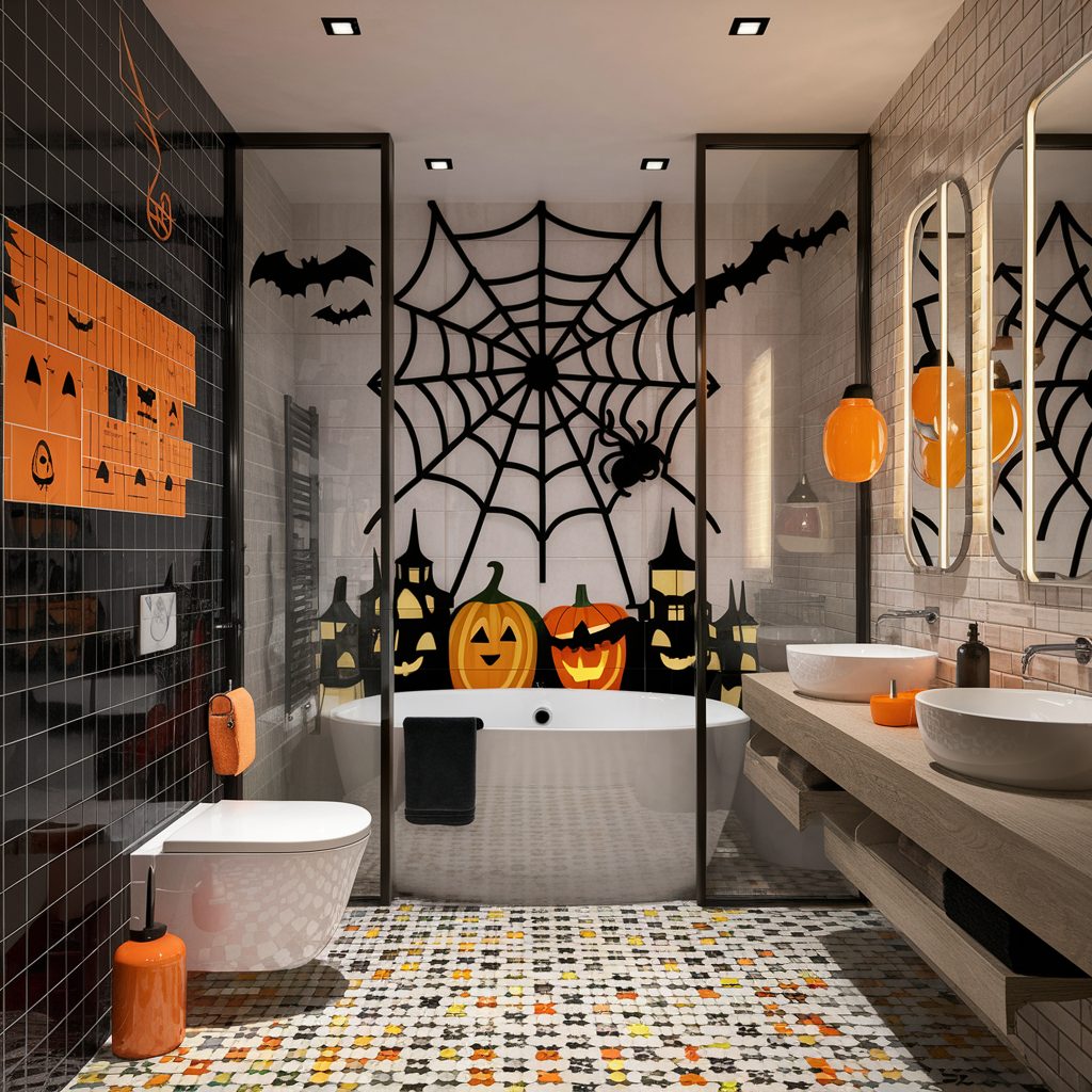 Think of your bathroom tiles as blank canvases just waiting for a Halloween-inspired makeover. With a little imagination, you can turn these surfaces into the backdrop for a festive and spooky display. An easy way to start is by applying Halloween-themed tile stickers or decals—choose from patterns featuring spider webs, flying bats, or cheerful pumpkins to instantly add seasonal flair.