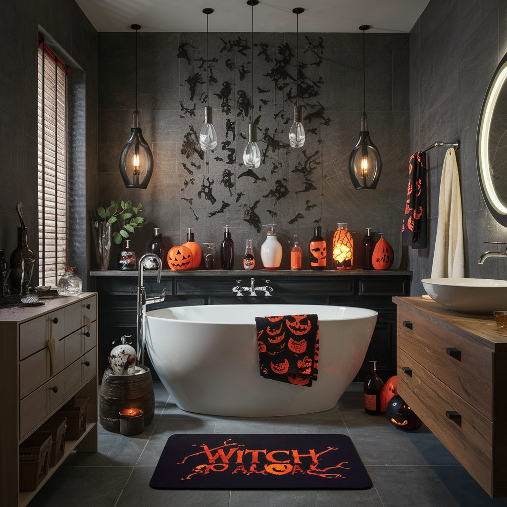 Once you’ve put together the core elements of your Halloween bathroom decor, it’s time to focus on the finishing touches that truly complete the look. Small details can make a big impact—consider crafting DIY Halloween-themed labels for your bath care products, transforming everyday bottles into “Witch’s Elixir” or “Zombie Wash” for a fun and spooky twist.