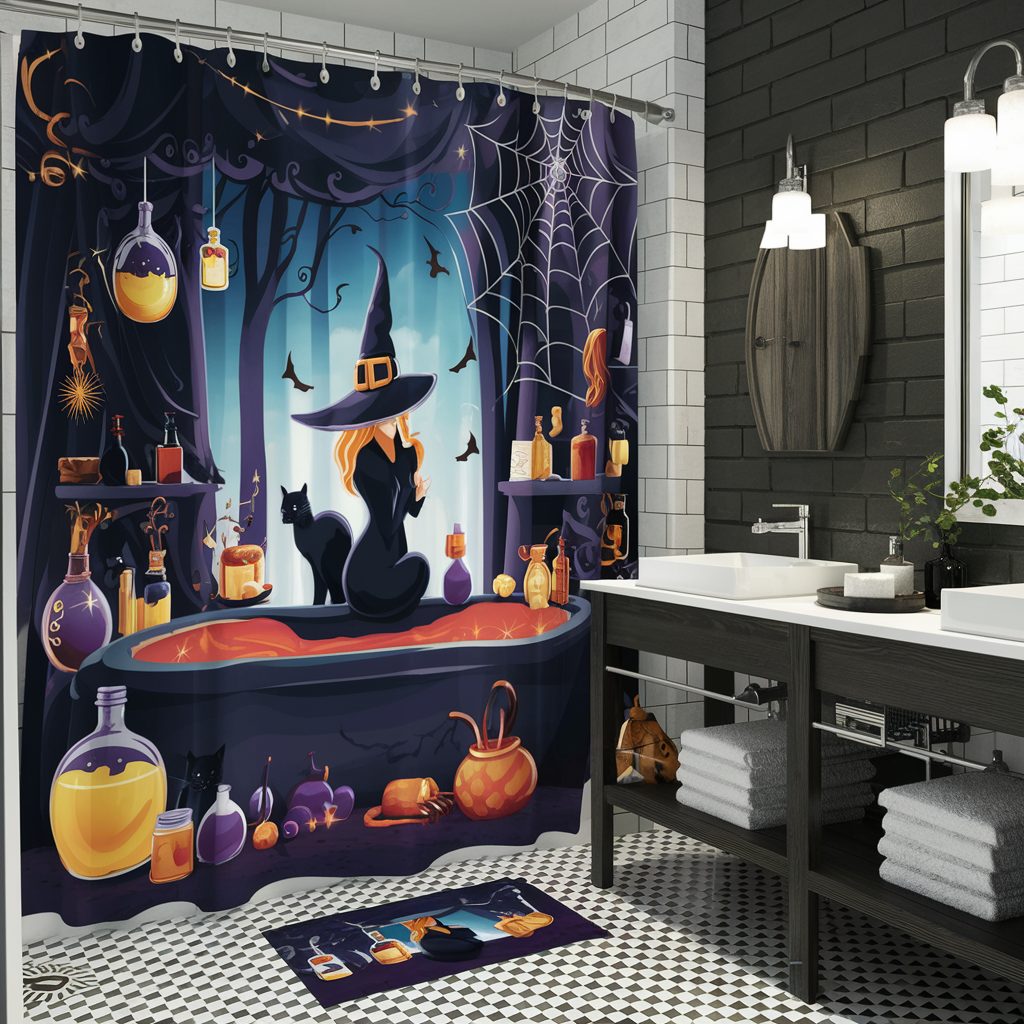 This theme works exceptionally well in smaller bathrooms, where even a few carefully placed items can create maximum visual impact. To complete the magical setting, add a witch-themed shower curtain or bath mat featuring cauldrons, spell books, or flying witches—finishing touches that fully capture the charm and mystique of a Halloween-ready witch’s bathroom.