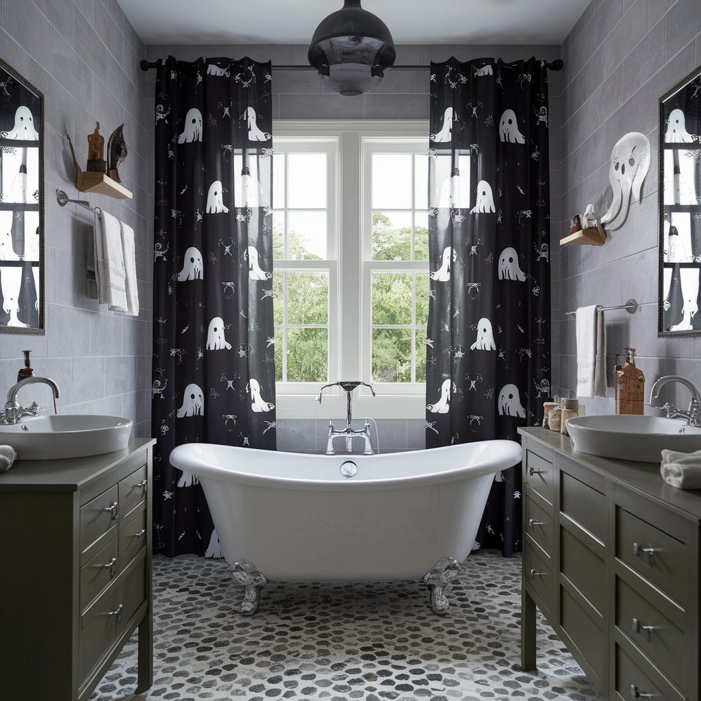 Planning to decorate your bathroom for Halloween? Don’t overlook the windows—they’re a great opportunity to add extra layers of spooky charm. Swap out your usual curtains for ones featuring Halloween themes like flying witches, ominous bats, or eerie silhouettes to instantly enhance the atmosphere.