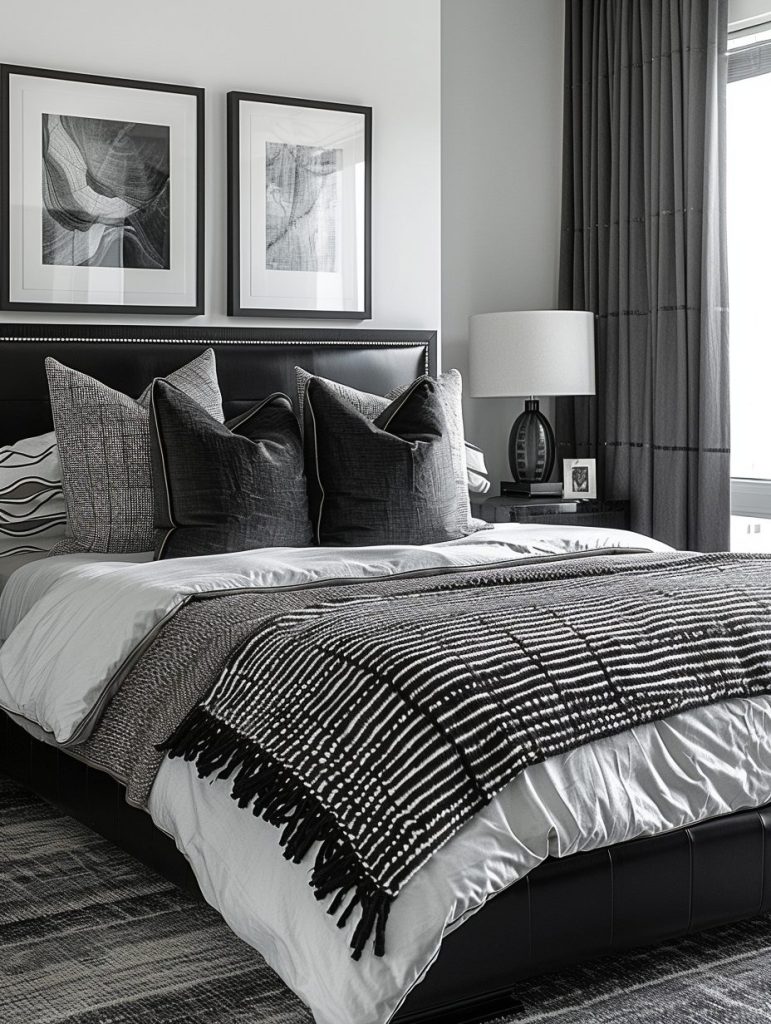 With black furniture, white walls, and gray accents, the space will feel both stylish and unique—perfect for a contemporary interior design theme.