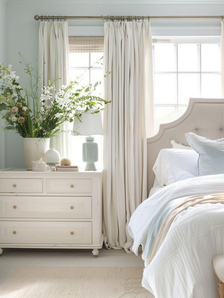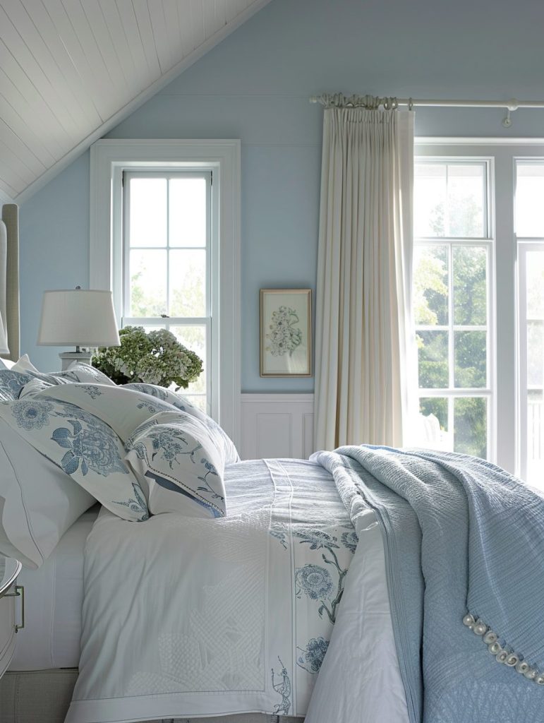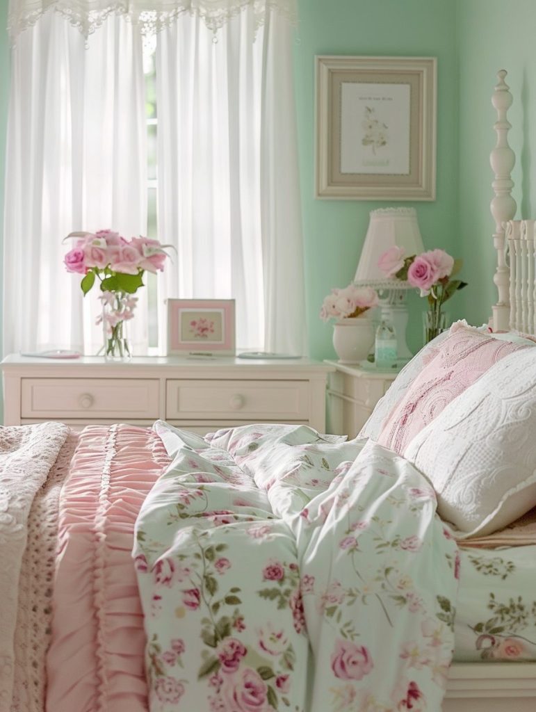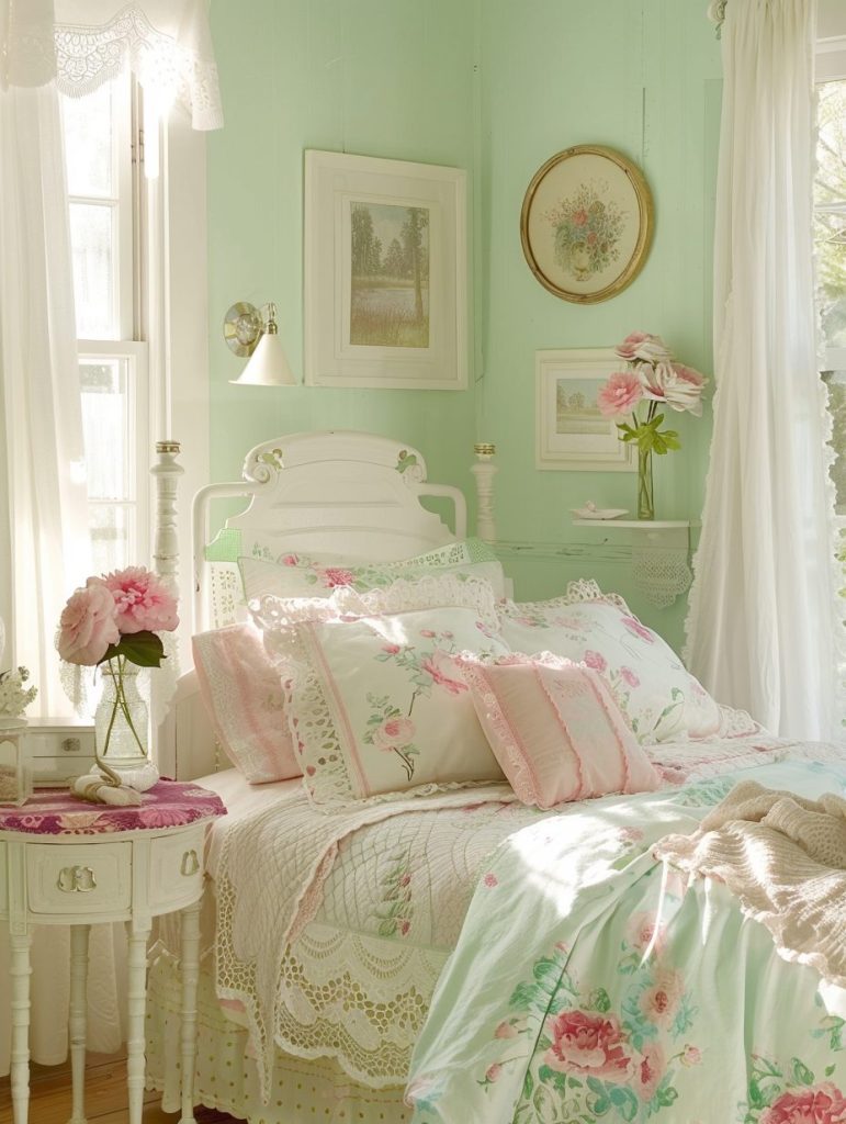 These colors work beautifully with white or light wooden furniture, along with delicate decor like lace curtains or floral prints. Together, they turn the room into a quiet and relaxing retreat where you can truly unwind.