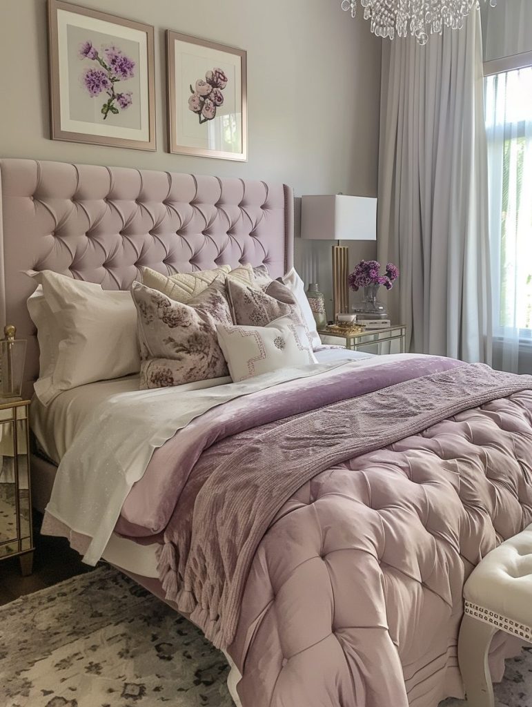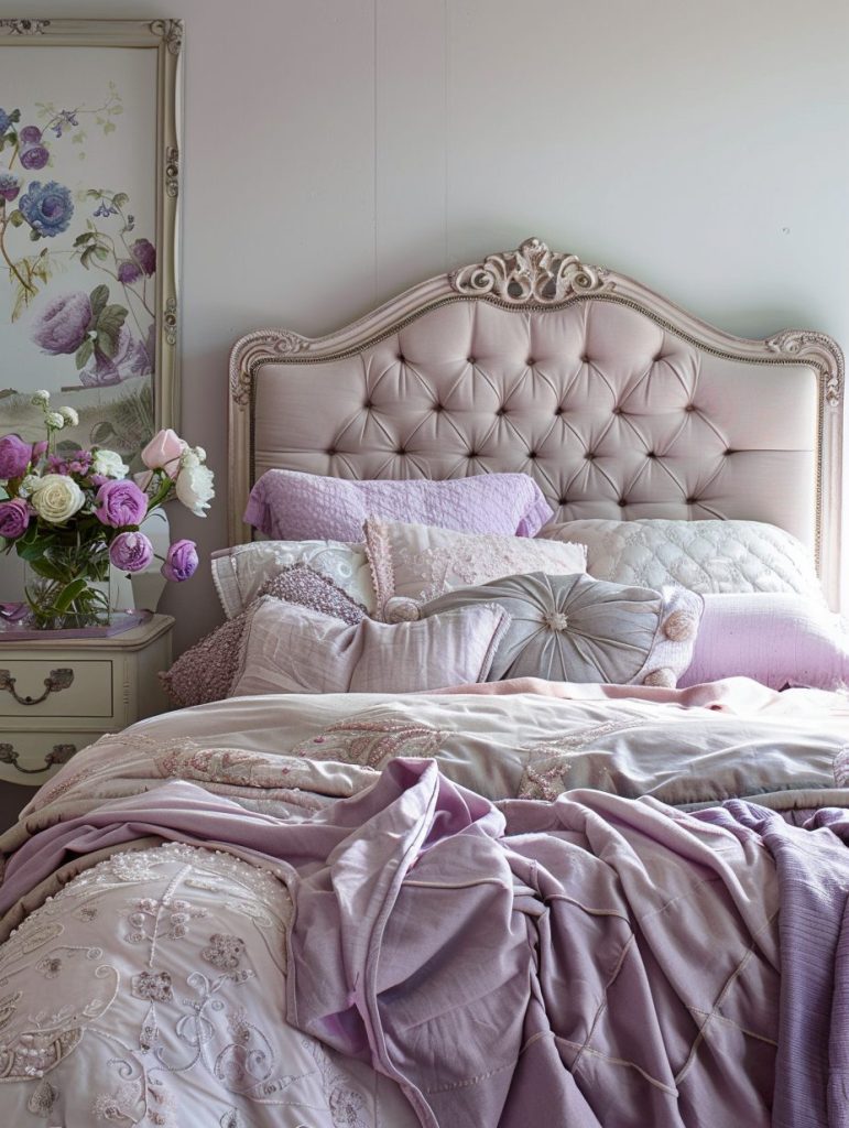 Add a romantic touch to your bedroom with soft pink and purple tones. Shades like blush pink and lavender create a dreamy, gentle atmosphere. To make the space even more charming, include elegant furniture pieces like a tufted headboard and light, delicate decor.