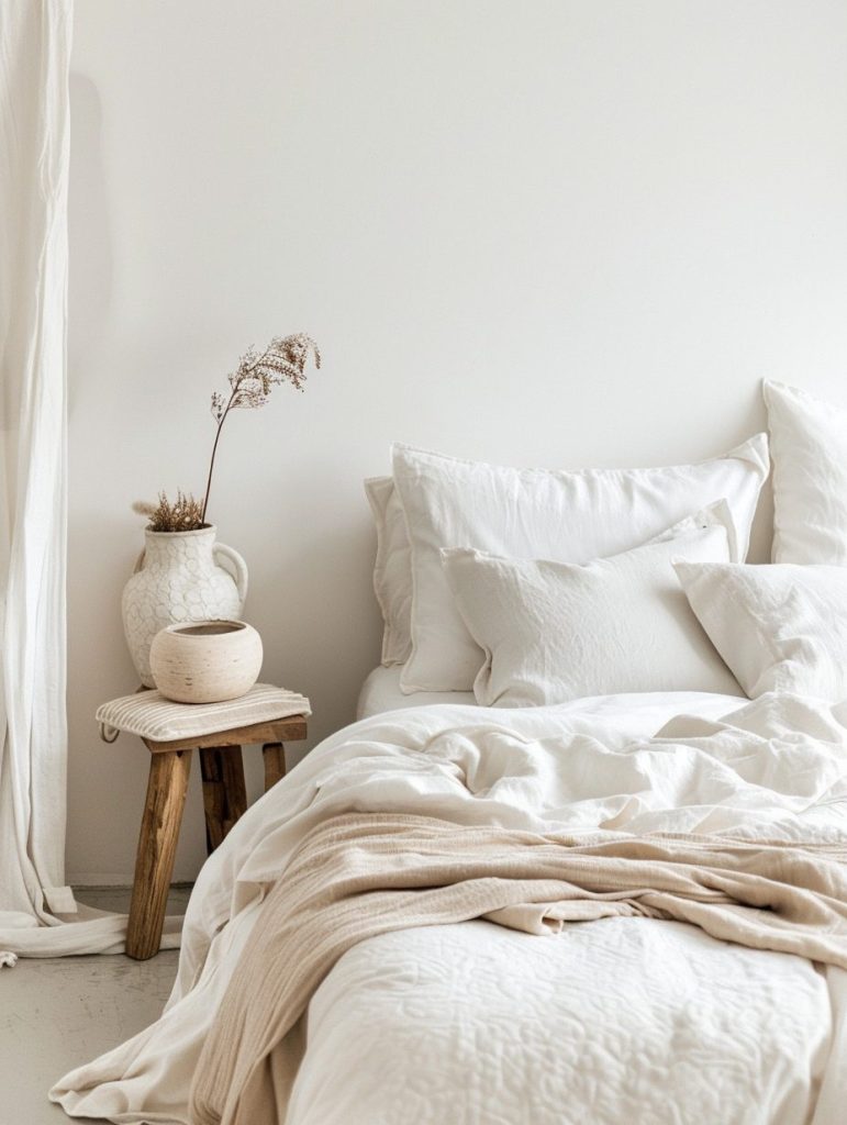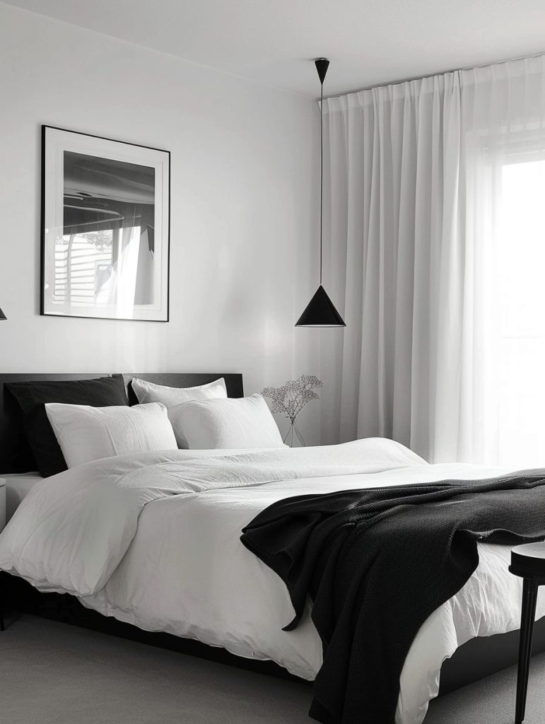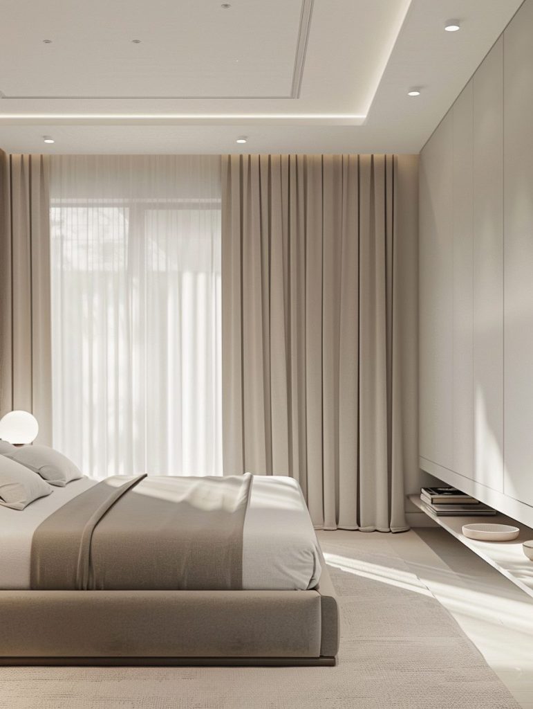 To create a peaceful and minimalist bedroom, choose a simple style with a soft monochrome color scheme. Shades like white, light gray, and pale beige offer a calm and open feel.