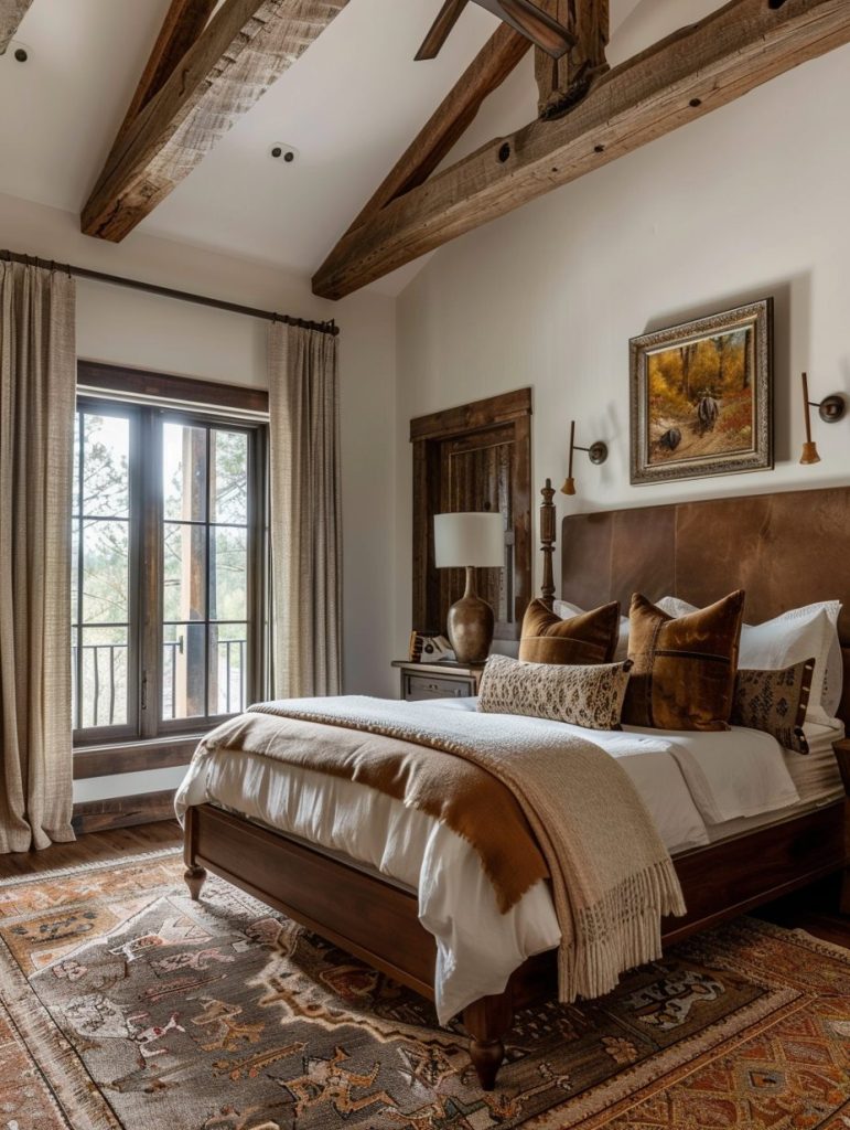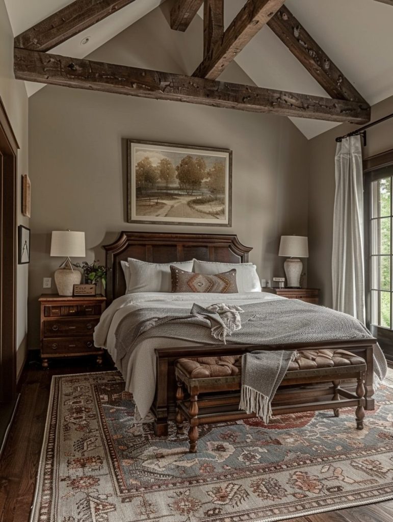 Bringing a natural and earthy feel into your bedroom works well with a color palette of warm browns and earth tones. You can include dark wood furniture, wooden beams, or soft wool rugs to add character.
