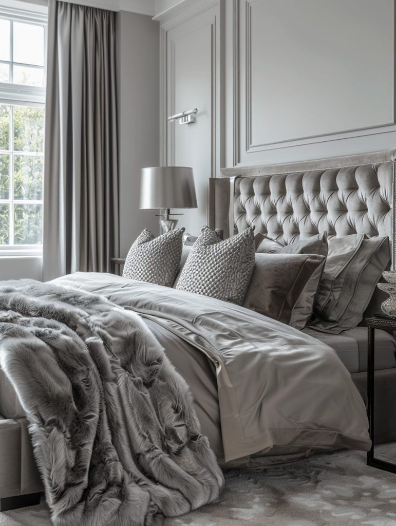 You can also include a gray headboard and a soft bedspread to bring in a touch of luxury. This color scheme is perfect for a modern and classy bedroom look.