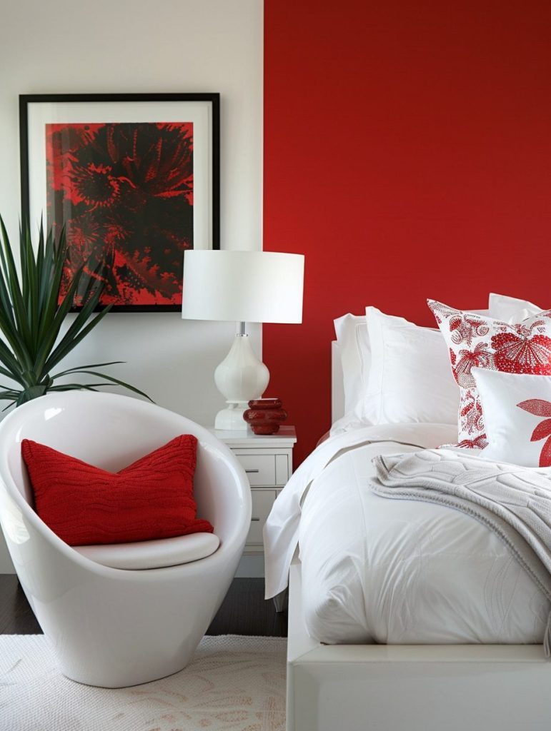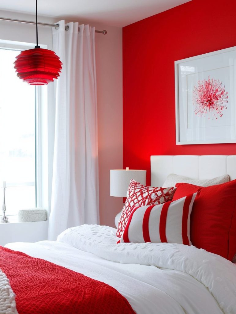 Red is a powerful choice for a bold and energetic bedroom, making a strong visual statement. You can use it on an accent wall or add it through bedding and decor pieces.