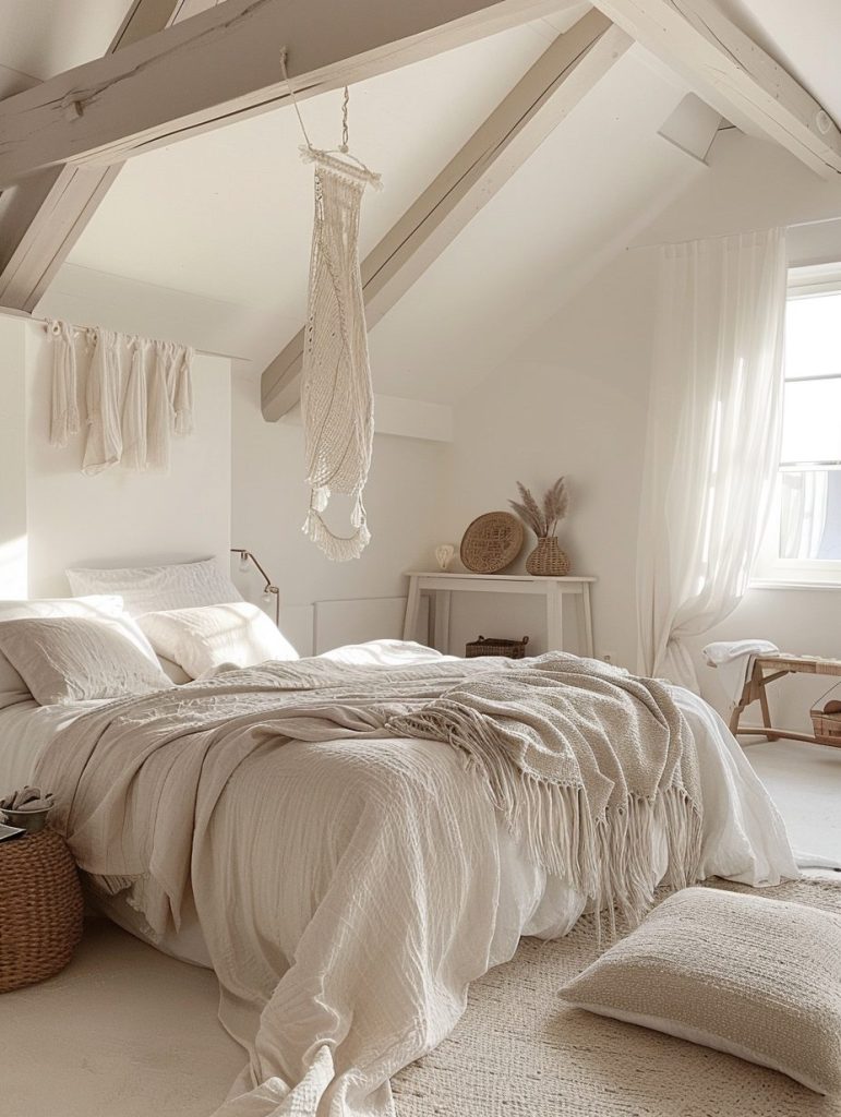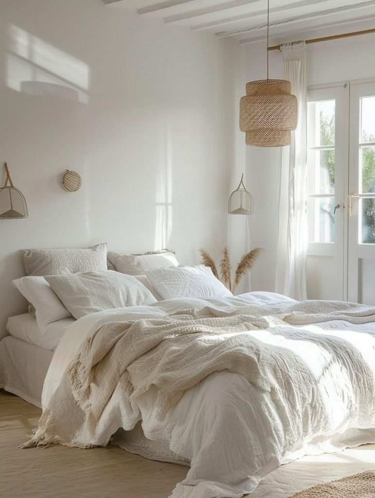 White is a great choice for creating a peaceful and calming bedroom. Use different shades of white on the walls, bedding, and furniture to build a soft and relaxing feel. Add variety with subtle textures and small details, so the space stays interesting without looking plain.
