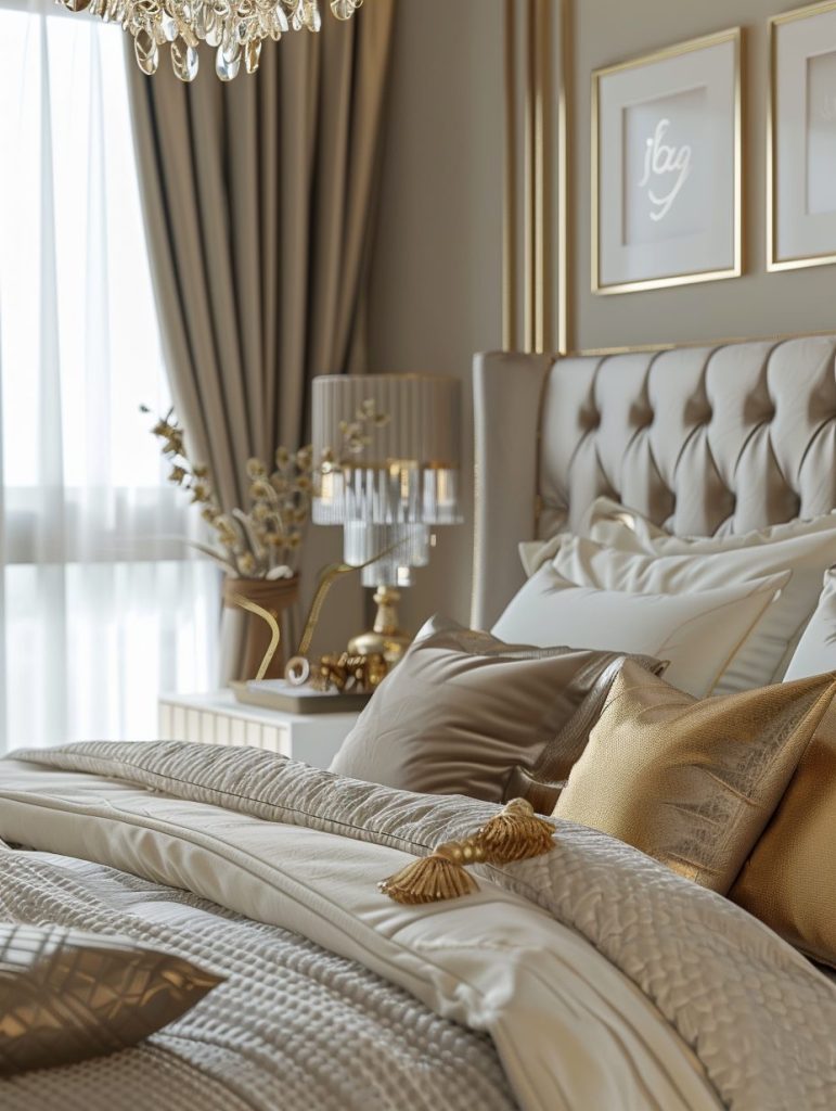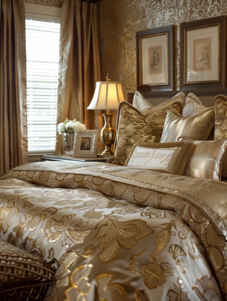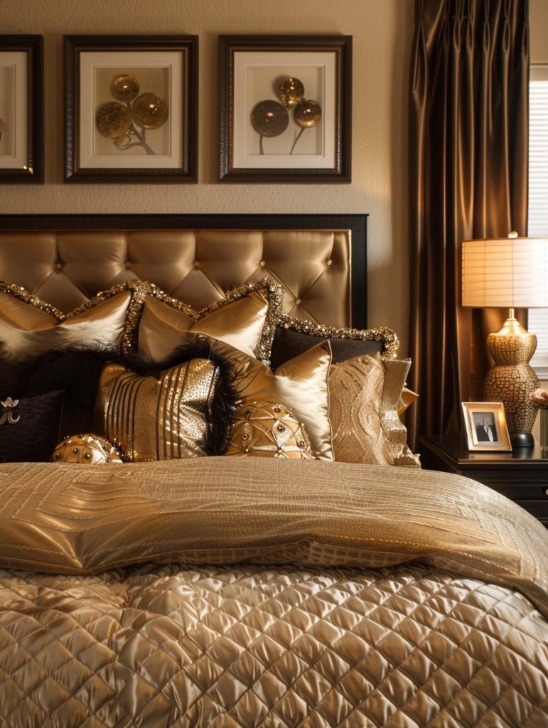 To give your bedroom a luxurious and elegant feel, consider using gold and bronze tones. These rich metallic shades work beautifully on accent items like lamps, picture frames, and throw pillows.