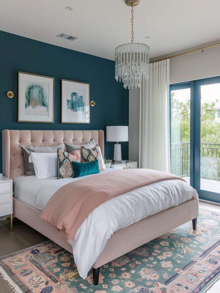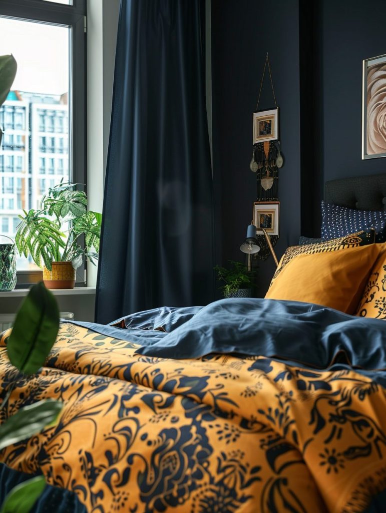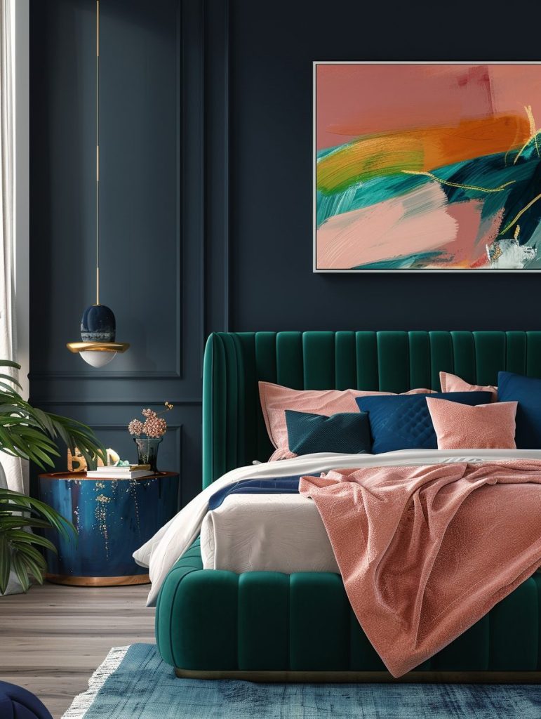 Use these tones in your bedding, curtains, and decor to make a strong visual impact. This approach is perfect for those who enjoy a unique, artistic, and personalized bedroom style.
