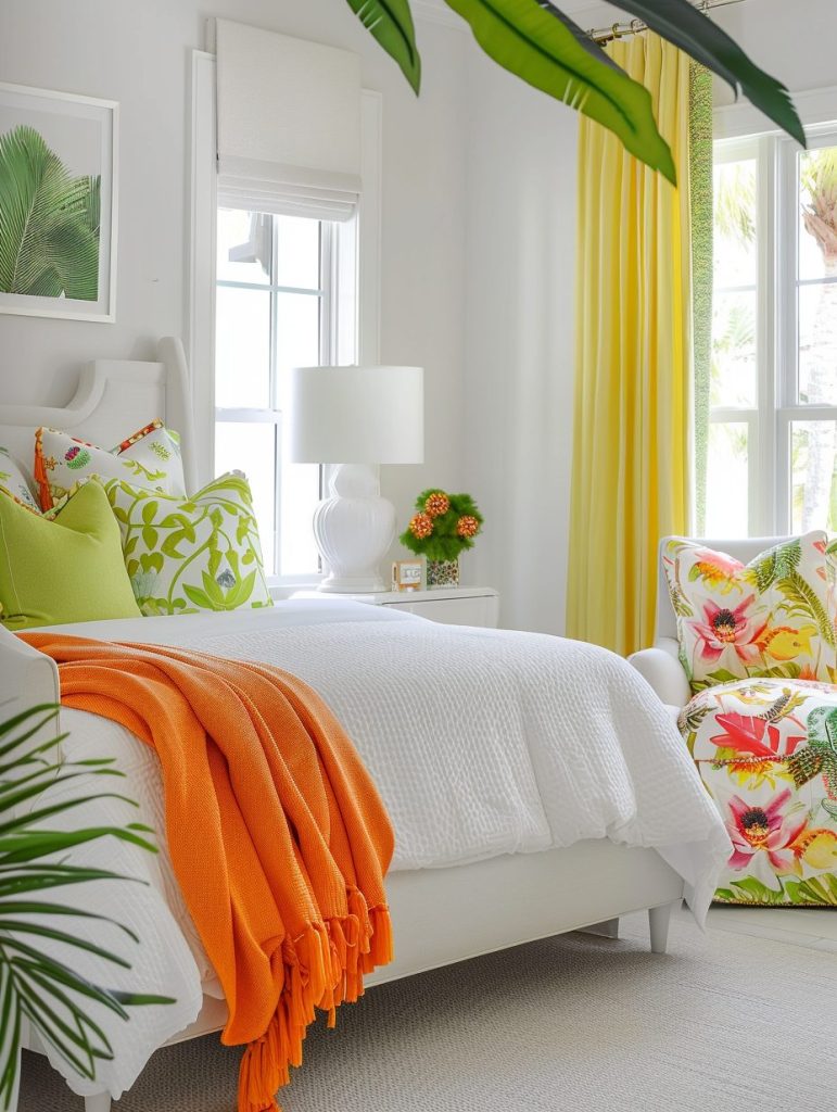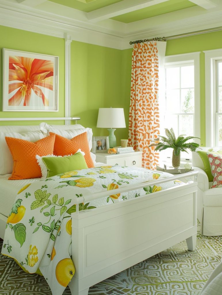 Citrus colors like lemon yellow, lime green, and tangerine orange can bring a fresh burst of energy into your bedroom. These bright and cheerful shades are perfect for accent walls, bedding, and small decor pieces.