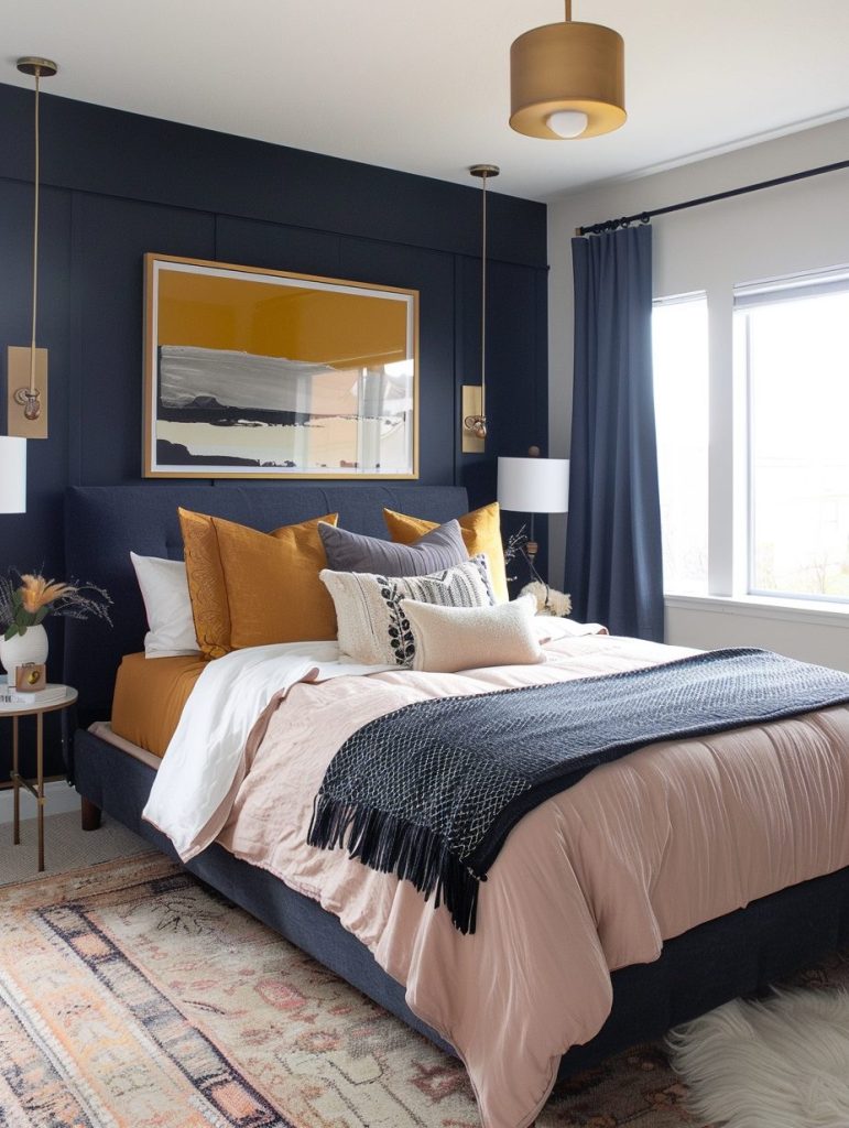 A balanced and stylish look can be achieved by combining two strong colors in your bedroom. Pairings like navy and blush or gray and mustard work well together to create a sense of harmony.