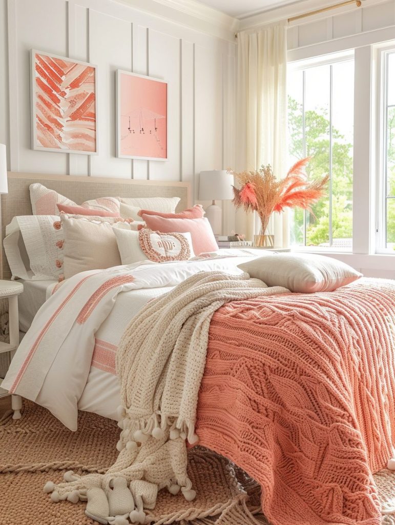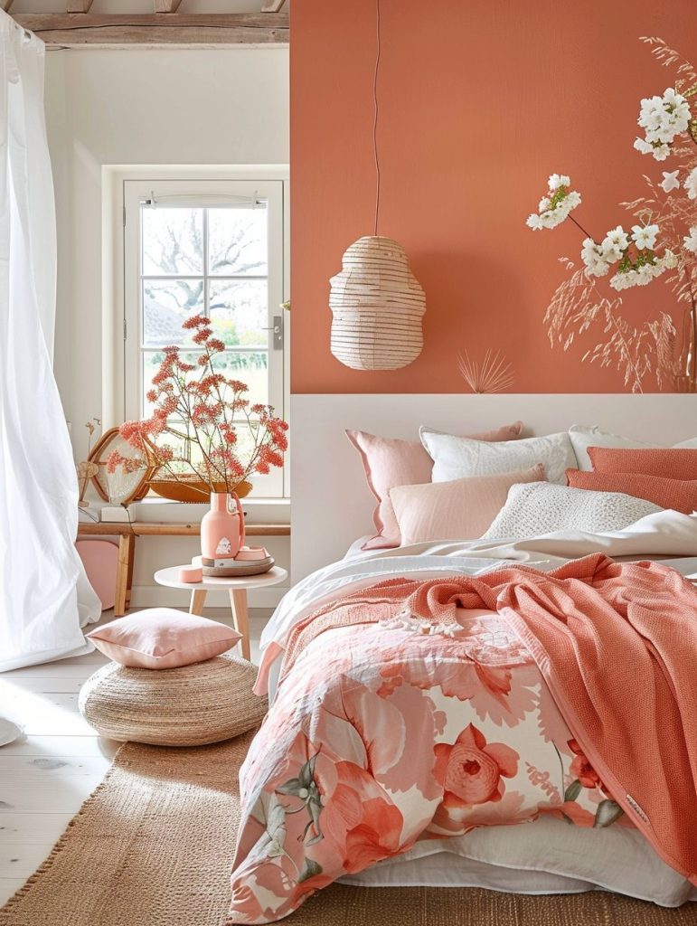 Using coral and peach tones is a wonderful way to create a warm and welcoming vibe in your bedroom. Whether you add these shades to the walls or through small decorative items, they can instantly brighten up the space.