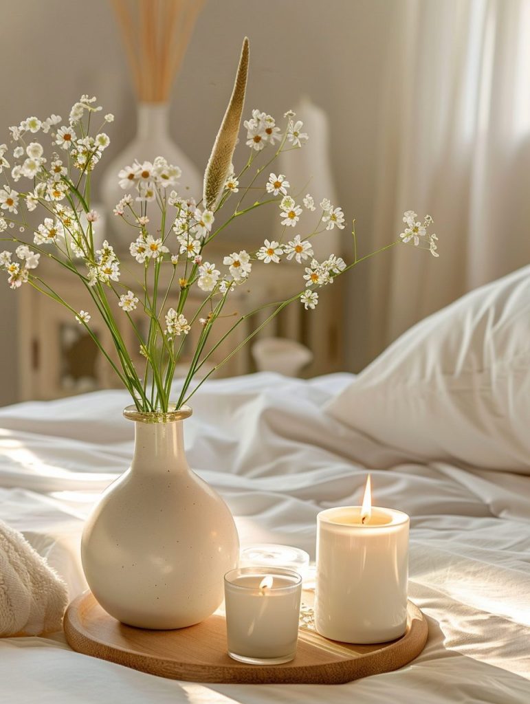 Scent plays an important role in creating a calm and peaceful feeling in the bedroom. You can use scented candles, essential oils, or even fresh flowers to bring lovely fragrances into the space.