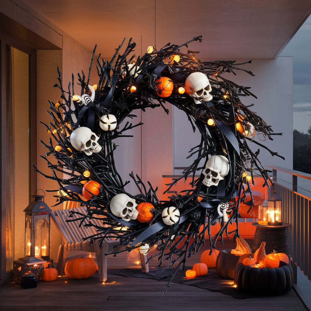 A Halloween wreath is a simple yet effective way to add a festive and spooky touch to your balcony decorations for the season. If you’re looking for a more Halloween-themed entrance, consider crafting a wreath made from dark, twisted twigs and embellishing it with mini skulls, fake spiders, and ribbons in soft, eerie tones.