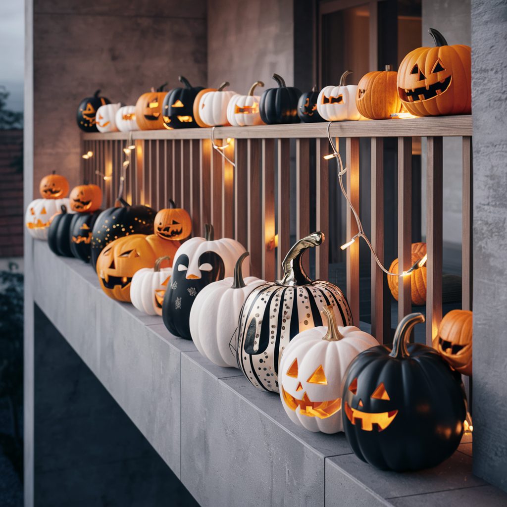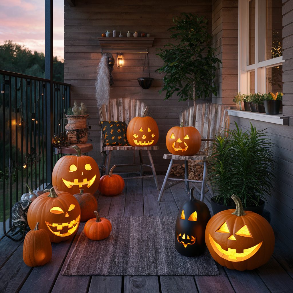 Pumpkins are undeniably the heart of any Halloween balcony décor, making them the perfect focal point for your DIY decorating project. Adorn your balcony with a variety of pumpkins—some featuring the classic jack-o’-lantern faces, and others showcasing intricate, artistic designs that offer a more refined touch.