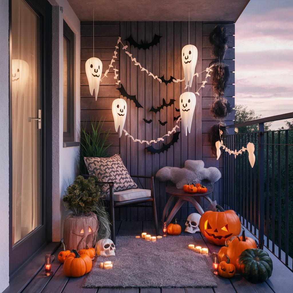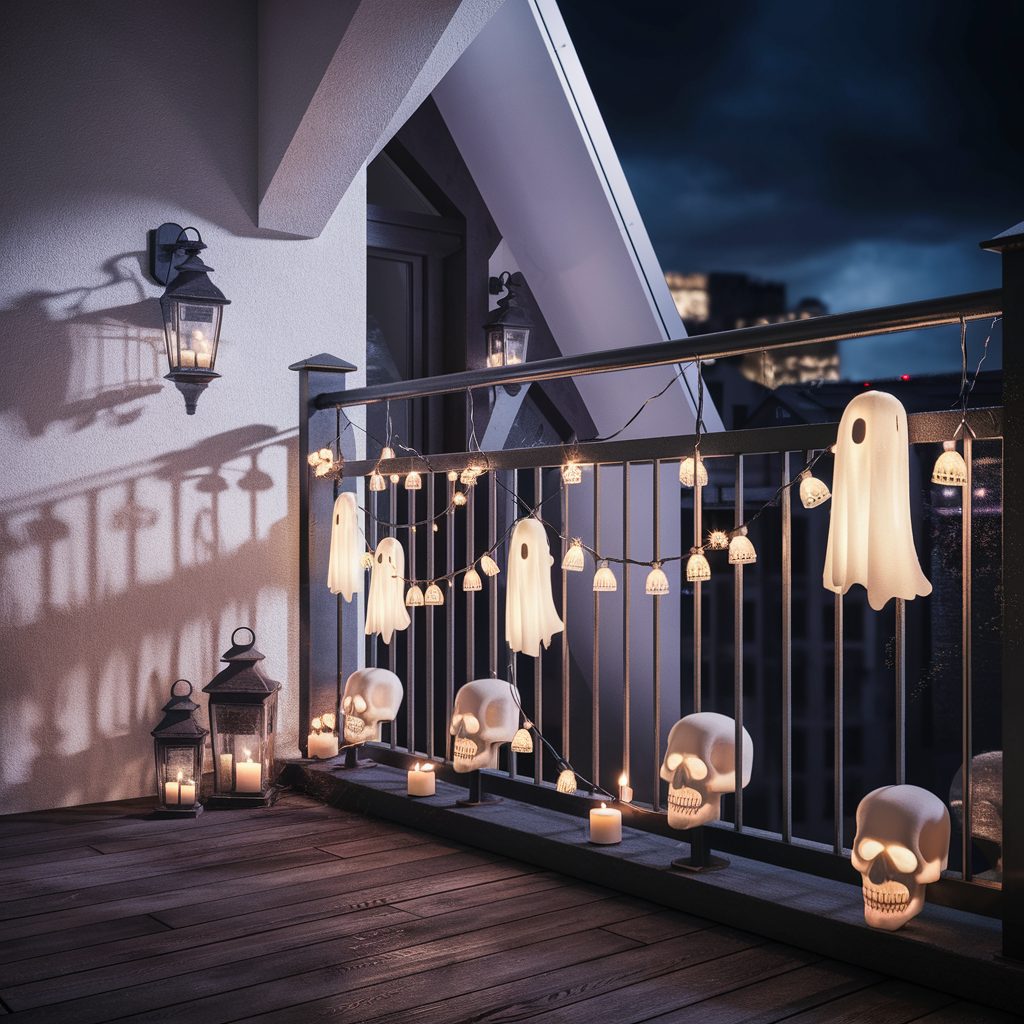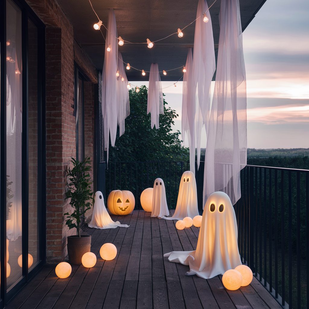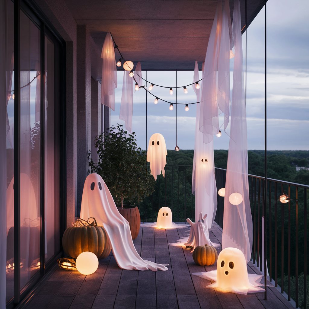 Ghosts are undoubtedly one of the most iconic and adaptable elements when it comes to Halloween decorations, especially for your indoor apartment balcony. To start, drape sheer white fabrics from the ceiling or railing to simulate the eerie floating presence of spirits.