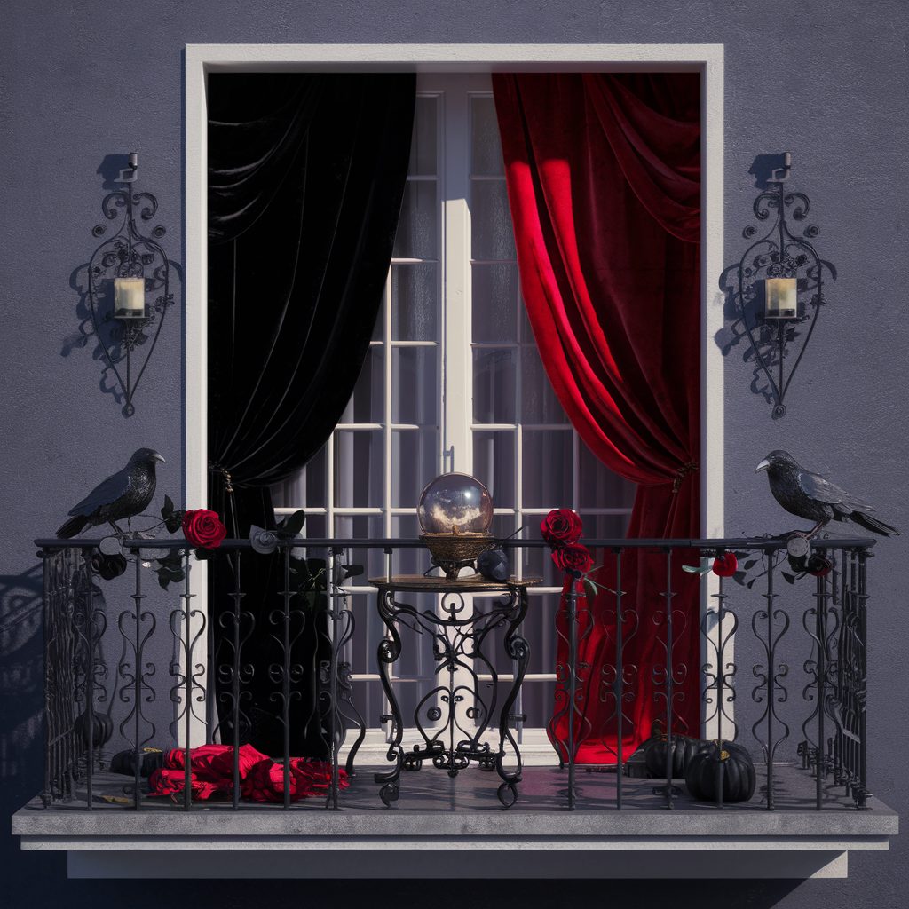 For an added touch of old-world charm, place a small vintage table in the center, adorned with a crystal ball as the focal point, surrounded by dark roses and fake crows. This combination of dark romance and subtle eeriness will transform your balcony into a space that’s both enchanting and slightly foreboding—a perfect choice for those who appreciate the timeless allure of gothic style.